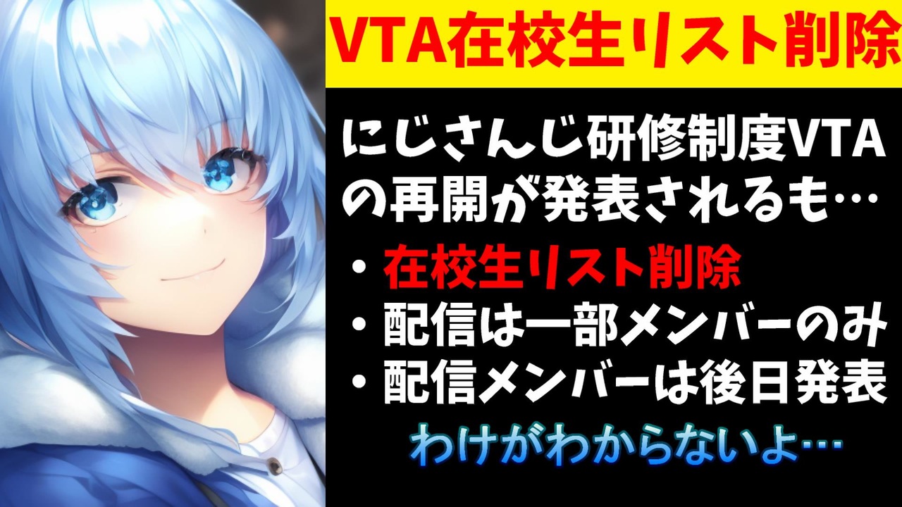 2023年10月4日、事実上のにじさんじ研修制度であるバーチャル・タレント・アカデミー(VTA)公式より大量粛清以降2か月ぶりとなるお知らせが発表されたのですが、在校生リスト削除などの不吉な文章が並んでいるとして話題になっています。<br><br>引用<br><a href="https://twitter.com/VTA_ANYCOLOR/status/1709449672098811943" target="_blank" rel="noopener nofollow">https://twitter.com/VTA_ANYCOLOR/status/1709449672098811943</a><br><br>Youtube <a href="https://www.youtube.com/@V_Virgin_Mary" target="_blank" rel="noopener nofollow">https://www.youtube.com/@V_Virgin_Mary</a><br>twitter <a href="https://twitter.com/V_Virgin_Mary" target="_blank" rel="noopener nofollow">https://twitter.com/V_Virgin_Mary</a><br><br>使用素材<br>高品質なフリー動画素材 - Pixabay <a href="https://pixabay.com/ja/videos" target="_blank" rel="noopener nofollow">https://pixabay.com/ja/videos</a>