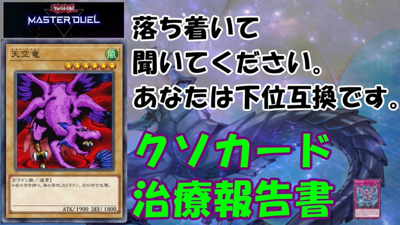 そう、見届けようというのね。この翼(レベル6 / 通常 / 1900 / 1800)が、彼ら(ドラゴン族上級バニラ)をどこに運ぶのかを。<br><br>クソカード医学会報告書、第3弾です。<br>今回の治療案は、ただ使っただけでは患者を使う必然性が見えにくいという欠点があります。<br>結構陰湿な戦法なのも相まって、カジュアルで使用すると「他にもっといるだろw」と鼻で笑われる可能性があります。ご利用は計画的に。<br><br><span style="color: #ff0000;">10/27 追記<br>8000再生、320コメント越え!感謝!<br><br>広告していただいた方:<br>うきゅう さん、ケスト さん、二式内火艇@エンジョイ勢 さん、Lemo さん、しげおう さん、ビュルルル さん、弾圧されていない民 さん、プクプク さん、あたりめ さん、パルミジャーノ根岸 さん、んじゃら さん<br>ありがとうございました!</span><br><br><br>今回遊んだゲーム:<br> 遊戯王マスターデュエル <a href="https://www.konami.com/yugioh/masterduel/jp/ja/" target="_blank" rel="noopener nofollow">https://www.konami.com/yugioh/masterduel/jp/ja/</a><br><br>リスペクト先:<br>あまくだり 様 <a href="https://www.nicovideo.jp/user/82678858" target="_blank" rel="noopener nofollow">https://www.nicovideo.jp/user/82678858</a><br><br>前回 <a href="https://www.nicovideo.jp/watch/sm42745762" class="watch">sm42745762</a> / 次回 <a href="https://www.nicovideo.jp/watch/sm42919057" class="watch">sm42919057</a><br><br>作った動画 <a href="https://www.nicovideo.jp/mylist/72794101" target="_blank" rel="noopener">mylist/72794101</a>