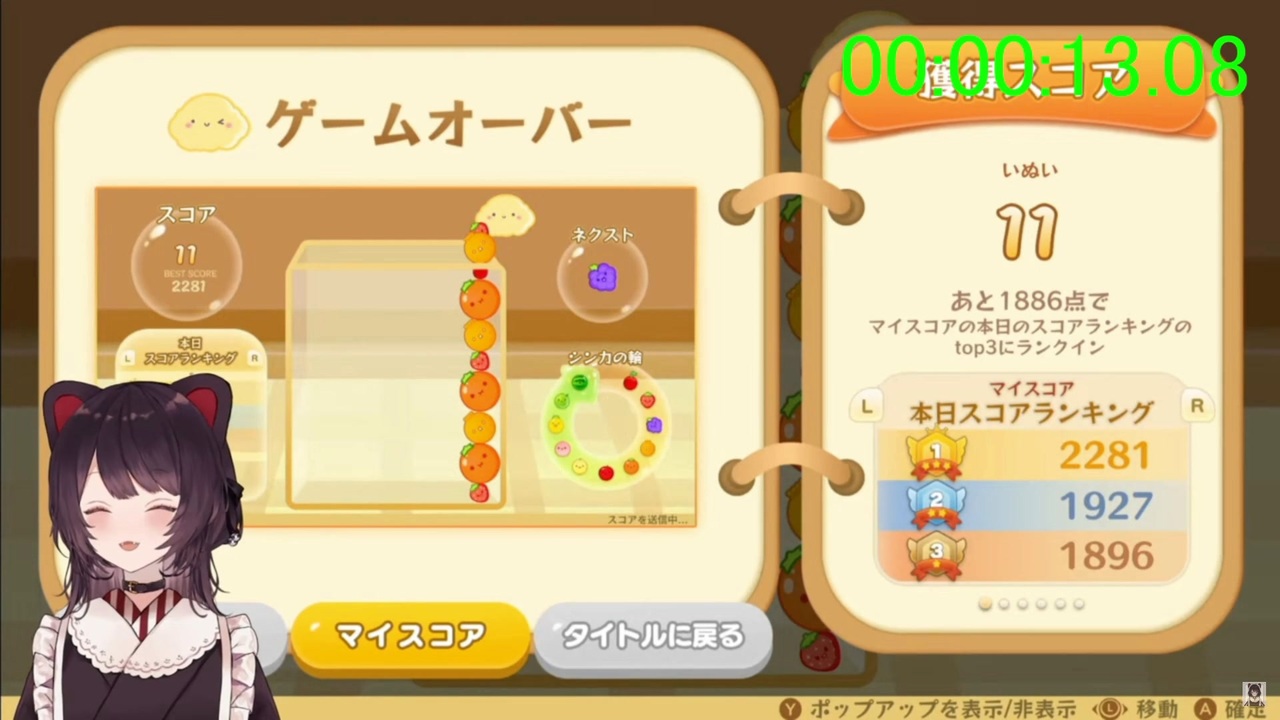 レギュレーション:<br>「ゲームスタート」または「リトライ」を押して「Ready」が<br>表示される時間を0:01.667とする。(動画内では上手く編集できなかったため、00:01.60)<br><br>ゲームが終了し、フルーツが振動し始めたら、タイマーストップ。<br><br>記録:<br>2023/10/5時点<br><a href="https://www.speedrun.com/ja-JP/WatermelonGame?h=gameover-switch&x=zd3memr2-ql6wz6jn.10v0mk2l" target="_blank" rel="noopener nofollow">https://www.speedrun.com/ja-JP/WatermelonGame?h=gameover-switch&x=zd3memr2-ql6wz6jn.10v0mk2l</a><br><br>音小さいようなので上げなおします<br><br>前→<a href="https://www.nicovideo.jp/watch/sm42839004" class="watch">sm42839004</a> アンマオ、露呈する頭脳【にじさんじ切り抜き/アンジュ・カトリーナ/魔使マオ】<br>次→<br><br>元動画:<a href="https://www.youtube.com/live/mkDAI_-Z4lQ?si=FslgIxh0RHRKBZ6k" target="_blank" rel="noopener nofollow">https://www.youtube.com/live/mkDAI_-Z4lQ?si=FslgIxh0RHRKBZ6k</a><br>【スイカゲーム】みんなやってる!!!!!わたしもやる!!!!!!!【戌亥とこ/にじさんじ】