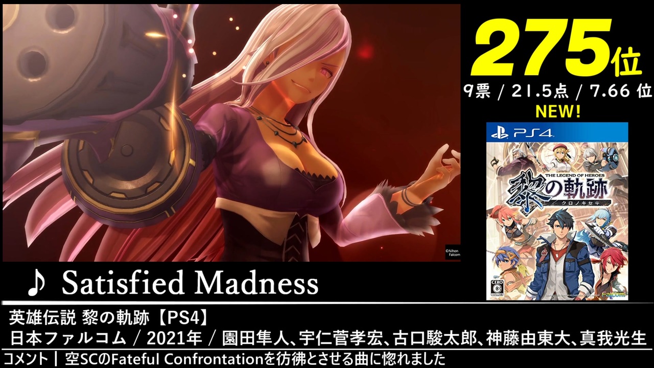 275位~250位の26曲を収録しています。<br>2022年5月1日~8月1日にかけて開催された「第15回みんなで決めるゲーム音楽ベスト100」の結果を動画化したものです。<span style="font-size: 10px;">集計人≠動画制作者</span><br><br>またまたまたま(ry素敵な応援イラストをいただきました!本当にありがとうございます!!!<br><br><br>↓全体の結果はこちら↓<br><a href="https://w.atwiki.jp/gamemusicbest100/pages/9902.html" target="_blank" rel="noopener nofollow">https://w.atwiki.jp/gamemusicbest100/pages/9902.html</a><br><br><br>※収録時間が5分以上の楽曲です。<br><a href="#" class="seekTime" data-seekTime="14:29" onclick="seekNicoPlayer('#14:29'); return false;">#14:29</a>~、<a href="#" class="seekTime" data-seekTime="30:42" onclick="seekNicoPlayer('#30:42'); return false;">#30:42</a>~、<a href="#" class="seekTime" data-seekTime="61:36" onclick="seekNicoPlayer('#61:36'); return false;">#61:36</a>~<br><br><br>Part.29→<a href="https://www.nicovideo.jp/watch/sm42821830" class="watch">sm42821830</a><br>Part.31→<a href="https://www.nicovideo.jp/watch/sm42881353" class="watch">sm42881353</a><br>第15回まとめ→<a href="https://www.nicovideo.jp/mylist/74713060" target="_blank" rel="noopener">mylist/74713060</a><br><br><br>【ショートカット】<br>275位<a href="#" class="seekTime" data-seekTime="0:40" onclick="seekNicoPlayer('#0:40'); return false;">#0:40</a> / 274位<a href="#" class="seekTime" data-seekTime="3:40" onclick="seekNicoPlayer('#3:40'); return false;">#3:40</a> / 273位<a href="#" class="seekTime" data-seekTime="6:35" onclick="seekNicoPlayer('#6:35'); return false;">#6:35</a> / 272位<a href="#" class="seekTime" data-seekTime="9:42" onclick="seekNicoPlayer('#9:42'); return false;">#9:42</a> / 271位<a href="#" class="seekTime" data-seekTime="14:29" onclick="seekNicoPlayer('#14:29'); return false;">#14:29</a> / 270位<a href="#" class="seekTime" data-seekTime="19:31" onclick="seekNicoPlayer('#19:31'); return false;">#19:31</a> / 269位<a href="#" class="seekTime" data-seekTime="22:54" onclick="seekNicoPlayer('#22:54'); return false;">#22:54</a> / 268位<a href="#" class="seekTime" data-seekTime="24:42" onclick="seekNicoPlayer('#24:42'); return false;">#24:42</a> / 267位<a href="#" class="seekTime" data-seekTime="28:18" onclick="seekNicoPlayer('#28:18'); return false;">#28:18</a> / 266位<a href="#" class="seekTime" data-seekTime="30:42" onclick="seekNicoPlayer('#30:42'); return false;">#30:42</a> / 265位<a href="#" class="seekTime" data-seekTime="36:08" onclick="seekNicoPlayer('#36:08'); return false;">#36:08</a> / 264位<a href="#" class="seekTime" data-seekTime="40:29" onclick="seekNicoPlayer('#40:29'); return false;">#40:29</a> / 263位<a href="#" class="seekTime" data-seekTime="44:21" onclick="seekNicoPlayer('#44:21'); return false;">#44:21</a> / 262位<a href="#" class="seekTime" data-seekTime="48:20" onclick="seekNicoPlayer('#48:20'); return false;">#48:20</a> / 261位<a href="#" class="seekTime" data-seekTime="49:59" onclick="seekNicoPlayer('#49:59'); return false;">#49:59</a> / 260位<a href="#" class="seekTime" data-seekTime="52:23" onclick="seekNicoPlayer('#52:23'); return false;">#52:23</a> / 259位<a href="#" class="seekTime" data-seekTime="54:45" onclick="seekNicoPlayer('#54:45'); return false;">#54:45</a> / 258位<a href="#" class="seekTime" data-seekTime="56:39" onclick="seekNicoPlayer('#56:39'); return false;">#56:39</a> / 256位①<a href="#" class="seekTime" data-seekTime="61:36" onclick="seekNicoPlayer('#61:36'); return false;">#61:36</a> / 256位②<a href="#" class="seekTime" data-seekTime="66:44" onclick="seekNicoPlayer('#66:44'); return false;">#66:44</a> / 255位<a href="#" class="seekTime" data-seekTime="68:52" onclick="seekNicoPlayer('#68:52'); return false;">#68:52</a> / 254位<a href="#" class="seekTime" data-seekTime="71:00" onclick="seekNicoPlayer('#71:00'); return false;">#71:00</a> / 253位<a href="#" class="seekTime" data-seekTime="73:40" onclick="seekNicoPlayer('#73:40'); return false;">#73:40</a> / 252位<a href="#" class="seekTime" data-seekTime="78:13" onclick="seekNicoPlayer('#78:13'); return false;">#78:13</a> / 251位<a href="#" class="seekTime" data-seekTime="80:35" onclick="seekNicoPlayer('#80:35'); return false;">#80:35</a> / 250位<a href="#" class="seekTime" data-seekTime="83:20" onclick="seekNicoPlayer('#83:20'); return false;">#83:20</a>