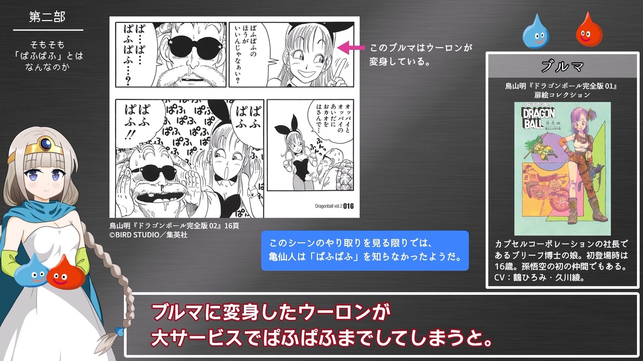 <strong>スライムをはじめ数々のモンスターやキャラクタをデザインされた鳥山明先生が逝去されました。<br>先生の数々の功績を偲び,心より哀悼の意を表します。<br>2024年(令和6年)3月8日</strong><br><br><span style="color: #cccccc;">(DQ2~4は)</span>初投稿です。<br>ファミリーコンピュータ(ファミコン/FC)ソフト『ドラゴンクエスト』シリーズのⅠ~Ⅳのぱふぱふを紹介します。<br>「ぱふぱふRTA」もあるよ!<br><br>前:<a href="https://www.nicovideo.jp/watch/sm42702125" class="watch">sm42702125</a> 次:<a href="https://www.nicovideo.jp/watch/sm45696482" class="watch">sm45696482</a><br>投稿した動画:<a href="https://www.nicovideo.jp/mylist/75151575" target="_blank" rel="noopener">mylist/75151575</a><br><br>【たくさんのコメント・広告・いいね!・ギフト・フォロー・マイリストありがとうございます。】<br>【15万再生ありがとうございます!】<br><br>----<br>第一部 そもそも「ぱふぱふ」とはなんなのか<br>第二部 ドラゴンクエスト(ドラクエ1 DQ1)<br>第三部 ドラゴンクエストⅡ(ドラクエ2 DQ2)<br>第四部 ドラゴンクエストⅢ(ドラクエ3 DQ3)<br>第五部 ドラゴンクエストⅣ(ドラクエ4 DQ4)<br>第六部 ドラゴンクエストⅣ 第一章ぱふぱふRTA<br>----<br><br>この動画で利用している株式会社スクウェア・エニックスを代表とする共同著作者が権利を所有する著作物及びスギヤマ工房有限会社が権利を所有する楽曲の転載・配布は禁止いたします。<br>© 1986 ARMOR PROJECT/BIRD STUDIO/SPIKE CHUNSOFT/SQUARE ENIX All Rights Reserved.<br>© SUGIYAMA KOBO<br>