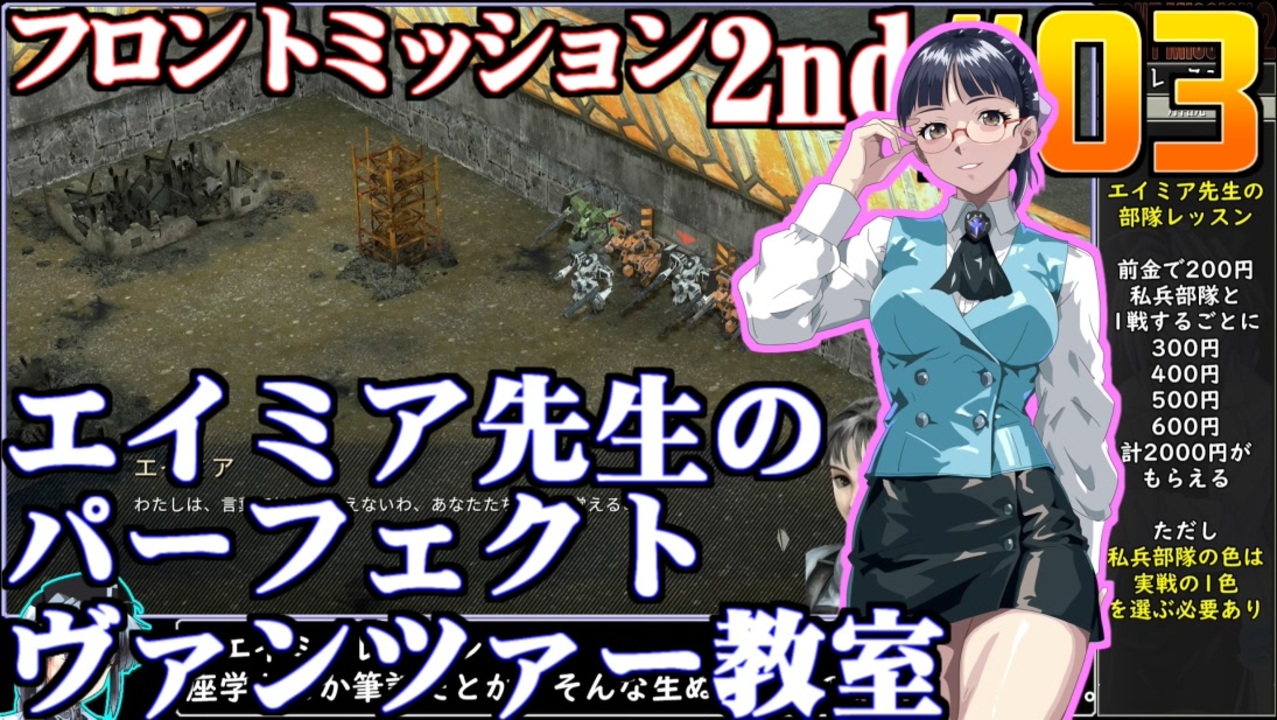 初革新的夜の個人レッスンなので初投稿です。<br><a href="https://seiga.nicovideo.jp/seiga/im11285405" target="_blank" rel="noopener">im11285405</a><br>首都ダカ近郊~サルバシュ氏の邸宅<br><br>◆FRONT MISSION 2nd:REMAKE◆<br>1997年スクウェアより発売されたSRPG<br>バングラデシュから国名を改めたアジアの国、アロルデシュを巡る陰謀と<br>二足歩行戦車・ヴァンツァーでの戦いをえがいた作品。<br>2023年10月5日switch版発売<br>本プレイはswitch版の桜乃そら実況動画<br><br>◆ニコニコクリエイターサポート<br><a href="https://creator-support.nicovideo.jp/registration/1203831" target="_blank" rel="noopener nofollow">https://creator-support.nicovideo.jp/registration/1203831</a><br>動画制作の励みになります<br><br>◆Twitter<br><a href="https://twitter.com/ikamono8bit" target="_blank" rel="noopener nofollow">https://twitter.com/ikamono8bit</a><br>◆youtube<br><a href="http://www.youtube.com/c/IkamonoY" target="_blank" rel="noopener nofollow">http://www.youtube.com/c/IkamonoY</a><br><br>シリーズまとめ <a href="https://www.nicovideo.jp/user/1203831/series" target="_blank" rel="noopener nofollow">https://www.nicovideo.jp/user/1203831/series</a><br>作った動画全部 <a href="https://www.nicovideo.jp/mylist/42963985" target="_blank" rel="noopener">mylist/42963985</a><br>作った動画全部2<a href="https://www.nicovideo.jp/mylist/70404393" target="_blank" rel="noopener">mylist/70404393</a><br>FM1シリーズ <a href="https://www.nicovideo.jp/mylist/44840712" target="_blank" rel="noopener">mylist/44840712</a><br>FM2シリーズ <a href="https://www.nicovideo.jp/mylist/49797840" target="_blank" rel="noopener">mylist/49797840</a><br>FM3シリーズ <a href="https://www.nicovideo.jp/mylist/53164228" target="_blank" rel="noopener">mylist/53164228</a><br>FM4シリーズ <a href="https://www.nicovideo.jp/mylist/58678376" target="_blank" rel="noopener">mylist/58678376</a><br>FM5シリーズ <a href="https://www.nicovideo.jp/mylist/62245527" target="_blank" rel="noopener">mylist/62245527</a>