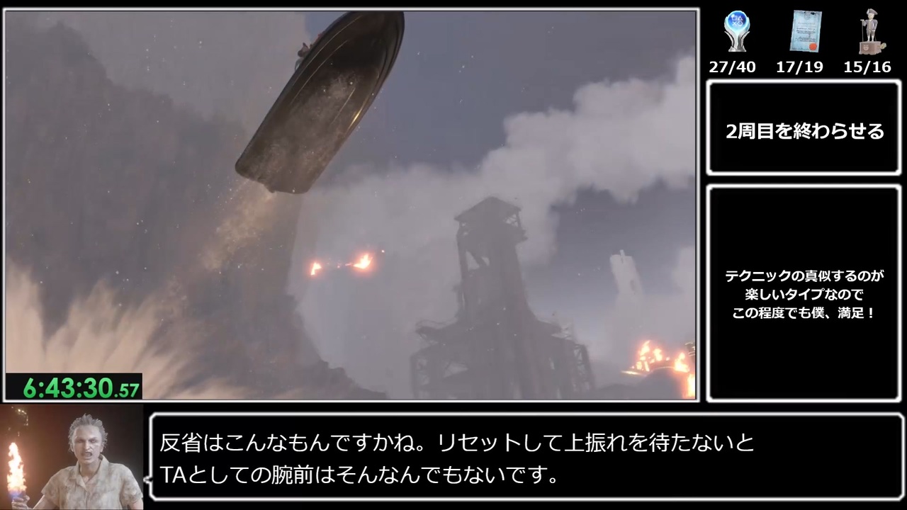 SWのNG ProでIGT1時間切れる気がしません。<br><br>2周目チャプター11~2周目終了まで<br><br>前→<a href="https://www.nicovideo.jp/watch/sm42848017" class="watch">sm42848017</a><br>次→<a href="https://www.nicovideo.jp/watch/sm42881951" class="watch">sm42881951</a><br><br>無編集版:<a href="https://youtu.be/6jxyTYf90BY" target="_blank" rel="noopener nofollow">https://youtu.be/6jxyTYf90BY</a><br>※録画時にOBSでタイマーをつけてるので、タイマーありますが無編集です<br><br>【使用機種】<br>・PS5<br><br>【計測区間】<br>・1周目難易度選択~右上にトロフィー「なけるぜ」取得ダイヤログが出た瞬間まで<br>※SEPARATE WAYS配信前のRTAです。SEPARATE WAYSのトロフィーを含みません。<br><br>【レギュ】<br>・壁抜け系バグ無し<br>・DLCなし(マーセナリーズ込み)<br>・チャーム無し<br>・コスチューム、アクセサリーは解放したら使ってOK<br><br>【諸注意】<br>・ゆっくりがしゃべります<br>・これ以降ずっとガバガバです<br>・編集で改善してほしい点があったら教えてね<br><br>