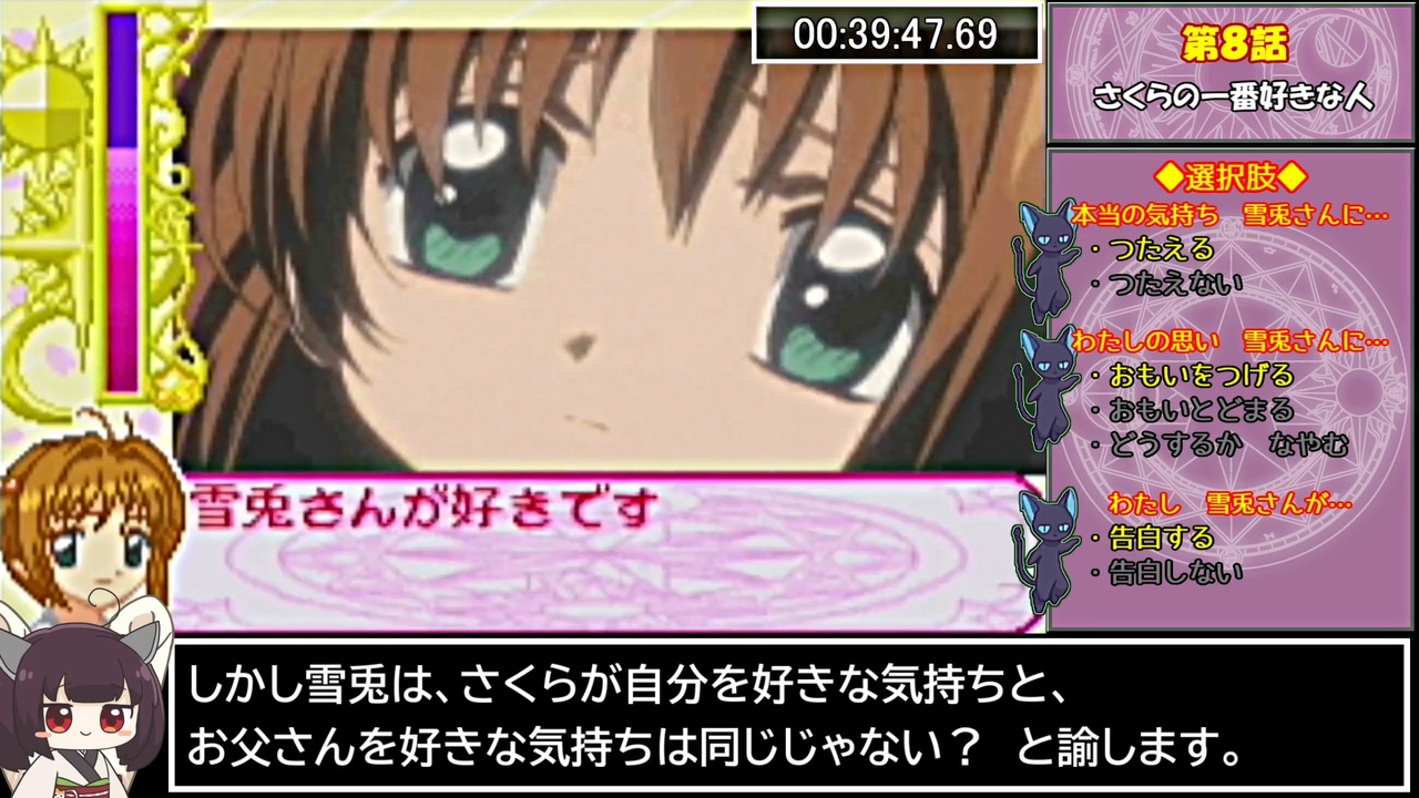 意外と暇が多かったので、オタク特有の早口語り多めでお送りしております<br><br>第6話開始~第9話終了まで<br><br>WS版のクロウカード編RTA→ <a href="https://www.nicovideo.jp/series/375617" target="_blank" rel="noopener">series/375617</a><br><a href="https://www.nicovideo.jp/watch/sm42830456" class="watch">sm42830456</a>←前|<a href="https://www.nicovideo.jp/mylist/75752290" target="_blank" rel="noopener">mylist/75752290</a>|次→<a href="https://www.nicovideo.jp/watch/sm43602462" class="watch">sm43602462</a><br><br>RTA part1集 <a href="https://www.nicovideo.jp/mylist/71936684" target="_blank" rel="noopener">mylist/71936684</a><br>進捗報告とか <a href="https://twitter.com/KemotooooN_RTA" target="_blank" rel="noopener nofollow">https://twitter.com/KemotooooN_RTA</a><br><br><strong><u>▼レギュレーション/縛り等</u></strong><br>・計測開始:『はじめから』を選択した瞬間<br>・計測終了:『小狼エンディング』が表示された瞬間<br>・小狼エンドの条件を満たすこと