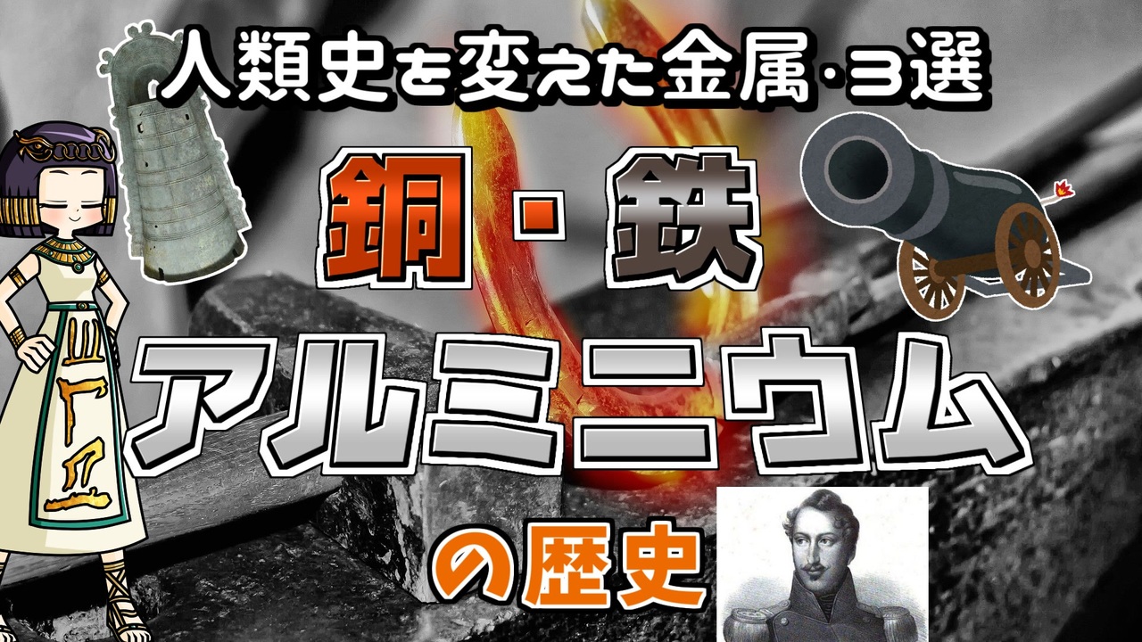 マリーは物欲をそそられているようです。<br><br>自然界にも道具を使う動物がいます。ある種の言語を持っているといわれる動物もいます。でも、金属を使えるのはさすがに人間くらいじゃないですか?多分。<br><br>そんな人間の文明とともにあった金属のお話です。<br><br>↓↓↓会員専用チャンネル「ヒストリカの離宮」もよろよろー<br><a href="https://ch.nicovideo.jp/mond-historica" target="_blank" rel="noopener nofollow">https://ch.nicovideo.jp/mond-historica</a><br><br><br>今回の参考文献:<br>佐藤健太郎(2018)『世界史を変えた新素材』新潮社<br>左巻健男(2021)『絶対に面白い化学入門 世界史は化学でできている』ダイヤモンド社 <br>小林登志子(2020)『古代メソポタミア全史』中央公論新社<br>中邑徹(2020)『地震とミノア文明』インタープレイ<br><br>その他 Wikipediaなど<br><br>twitter→<a href="https://twitter.com/mond_historica" target="_blank" rel="noopener nofollow">https://twitter.com/mond_historica</a><br />━━━━━━━━━━━━━━━━━━━━━<br><br>この動画はクリエイティブ・コモンズ継承(CC-BY-SA)ライセンスの素材を使用して制作しています。(<a href="https://creativecommons.org/licenses/by-sa/4.0/)" target="_blank" rel="noopener nofollow">https://creativecommons.org/licenses/by-sa/4.0/)</a><br>規約に基づき、この動画もCC-BY-SA 4.0 のもとで公開します。<br><br>投稿者共通情報☆彡<br><br>BGM, SE:ニコニ・コモンズ様<br><a href="http://commons.nicovideo.jp/" target="_blank" rel="noopener nofollow">http://commons.nicovideo.jp/</a><br>魔王魂様<br><a href="https://maoudamashii.jokersounds.com/" target="_blank" rel="noopener nofollow">https://maoudamashii.jokersounds.com/</a><br>Audiostock様<br><a href="https://audiostock.jp/" target="_blank" rel="noopener nofollow">https://audiostock.jp/</a><br><br>立ち絵 霊夢・魔理沙(黒子式):nicotalk様<br><a href="http://www.nicotalk.com/charasozai.html" target="_blank" rel="noopener nofollow">http://www.nicotalk.com/charasozai.html</a><br><br>立ち絵 パトラ、マリー、アン、メアリ:ライフライフ様<br><a href="https://0801lifelife.tumblr.com/" target="_blank" rel="noopener nofollow">https://0801lifelife.tumblr.com/</a><br><br>使用ツール1:ゆっくりムービーメーカー4<br><a href="https://manjubox.net/ymm4/" target="_blank" rel="noopener nofollow">https://manjubox.net/ymm4/</a><br><br>使用ツール2:AviUtl<br><a href="http://spring-fragrance.mints.ne.jp/aviutl/" target="_blank" rel="noopener nofollow">http://spring-fragrance.mints.ne.jp/aviutl/</a><br><br>各時代の地図 : World History Maps & Timelines <br><a href="http://geacron.com/home-en/" target="_blank" rel="noopener nofollow">http://geacron.com/home-en/</a><br><br>ゆっくりボイスについて:AquesTalkライセンス取得済み<br><br>キャラクターボイス<br>アン・ボニー:羽ノ華(A.I.VOICE)<br>メアリ・リード:琴葉 葵(A.I.VOICE)<br>クレオパトラ:結月ゆかり(VOICEROID2)<br>マリー‐アントワネット:東北きりたん (VOICEROID EX)<br>その他キャラ:青山龍星(A.I.VOICE)、伊織弓鶴(A.I.VOICE2)、栗田まろん(A.I.VOICE)、宮舞モカ(VOICEPEAK)、フリモメン(VOICEPEAK)<br><br><br><br>その他フリー素材ご提供元の皆様に圧倒的感謝<br>