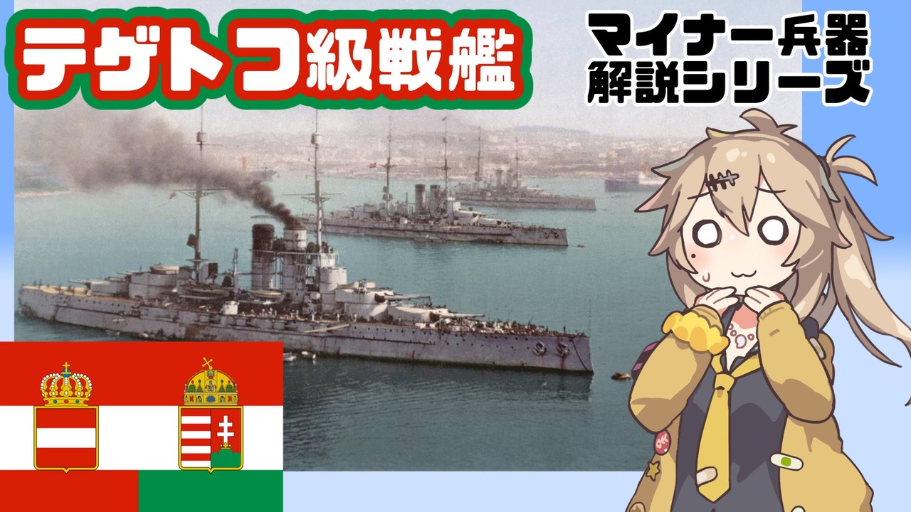 参考文献・映像全部書くには余白が足りない<br><a href="https://www.nicovideo.jp/mylist/74547937" target="_blank" rel="noopener">mylist/74547937</a><br>Youtube版→<a href="https://youtu.be/Tkhu_WY24qI" target="_blank" rel="noopener nofollow">https://youtu.be/Tkhu_WY24qI</a><br><br>参考文献:<br>日本・英語版Wikipedia<br><br>「オーストリア・ハンガリー二重帝国海軍 ヴィリブス・ウニーティス級戦艦」<br><a href="http://www.din.or.jp/~yamapan/html/military/austro-hungarianships/viribus%20unitis.html" target="_blank" rel="noopener nofollow">http://www.din.or.jp/~yamapan/html/military/austro-hungarianships/viribus%20unitis.html</a><br><br>「Austro-Hungarian Tegetthoff class dreadnought」<br><a href="http://croatian-treasure.com/main.html" target="_blank" rel="noopener nofollow">http://croatian-treasure.com/main.html</a><br>「Austria-Hungary 30.5 cm/45 (12") Škoda 30.5 cm/45 (12") K10 Škoda」<br><a href="http://www.navweaps.com/Weapons/WNAust_12-45.php#Additional_Pictures" target="_blank" rel="noopener nofollow">http://www.navweaps.com/Weapons/WNAust_12-45.php#Additional_Pictures</a><br>「Austro-Hungarian capital ship genesis」<br><a href="https://warshipprojects.com/2018/02/25/austro-hungarian-capital-ship-genesis/" target="_blank" rel="noopener nofollow">https://warshipprojects.com/2018/02/25/austro-hungarian-capital-ship-genesis/</a><br>「S.M.S. Viribus Unitis」<br><a href="http://viribusunitis.ca/viribus-unitis-class" target="_blank" rel="noopener nofollow">http://viribusunitis.ca/viribus-unitis-class</a><br><br>Belvedere Meridionale「Austro-hungarian battleships and battleship design 1904-1914/ Gun Turrets」<br><a href="https://issuu.com/belvederemeridionale/docs/kramlimihaly-2021-austro-hungarian_battleships_190/s/13556389" target="_blank" rel="noopener nofollow">https://issuu.com/belvederemeridionale/docs/kramlimihaly-2021-austro-hungarian_battleships_190/s/13556389</a><br>同著「Fire Control」<br><a href="https://issuu.com/belvederemeridionale/docs/kramlimihaly-2021-austro-hungarian_battleships_190/s/13556387" target="_blank" rel="noopener nofollow">https://issuu.com/belvederemeridionale/docs/kramlimihaly-2021-austro-hungarian_battleships_190/s/13556387</a><br><br>オーハン艦艇舷側図の引用元<br><a href="https://www.deviantart.com/tzoli/gallery" target="_blank" rel="noopener nofollow">https://www.deviantart.com/tzoli/gallery</a><br><br>使用素材集<br>BGM:アヒルのテーマ(鋼鉄の咆哮3より)<br>背景映像:昭和56年防衛庁記録<br><a href="https://youtu.be/_MF8zGUFn_Y" target="_blank" rel="noopener nofollow">https://youtu.be/_MF8zGUFn_Y</a><br>いらすと:いらすとや様