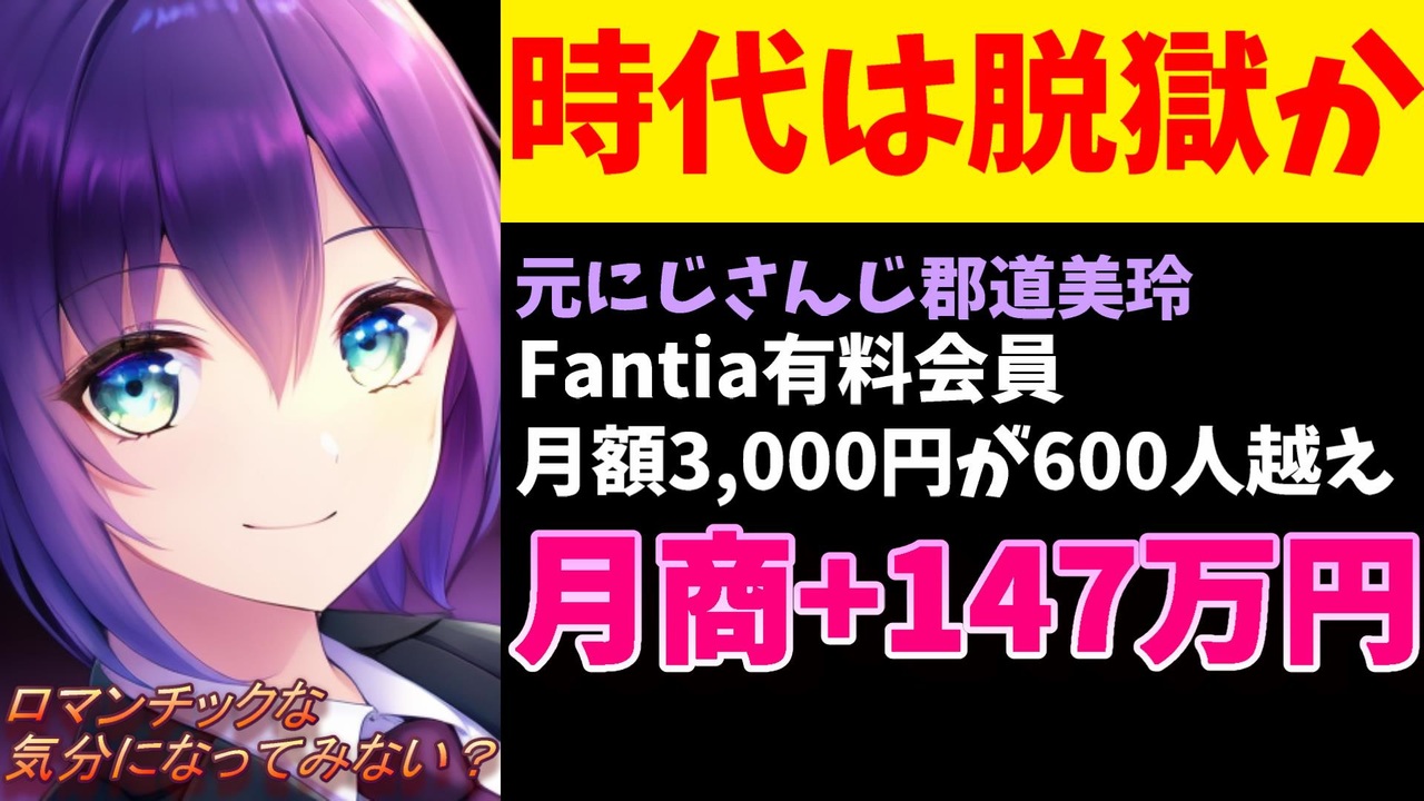 2023年9月30日、元にじさんじの郡道美玲ことゆめのさんが月額3000円のfantia有料メンバーが600人を超えたことを報告され話題になっています。7月末の時点で全盛期時代と売り上げが同程度と語られていただけに現在の収入はにじさんじ時代を大きく上回っている可能性が高いです。<br><br>引用<br><a href="https://twitter.com/g6mo2/status/1707854934161690989" target="_blank" rel="noopener nofollow">https://twitter.com/g6mo2/status/1707854934161690989</a><br><br>Youtube <a href="https://www.youtube.com/@V_Virgin_Mary" target="_blank" rel="noopener nofollow">https://www.youtube.com/@V_Virgin_Mary</a><br>twitter <a href="https://twitter.com/V_Virgin_Mary" target="_blank" rel="noopener nofollow">https://twitter.com/V_Virgin_Mary</a><br><br>使用素材<br>高品質なフリー動画素材 - Pixabay <a href="https://pixabay.com/ja/videos" target="_blank" rel="noopener nofollow">https://pixabay.com/ja/videos</a>