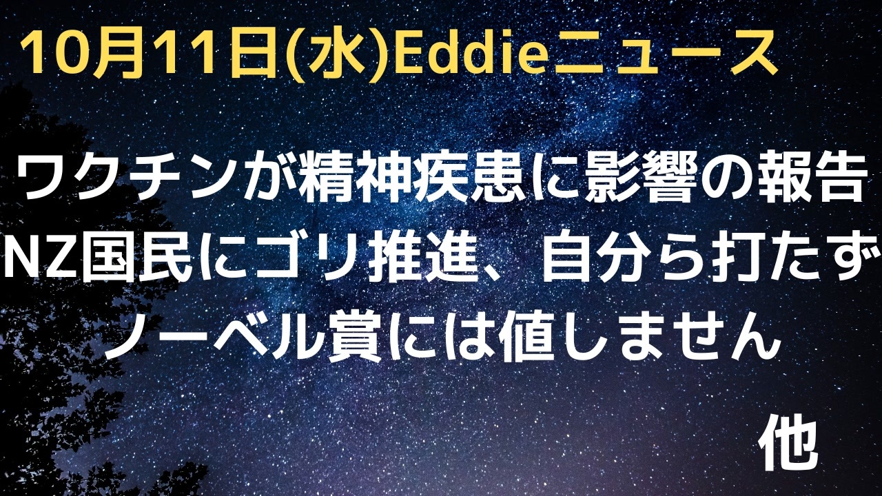 参考URL<br><a href="https://t.me/covidtruthnet/10101" target="_blank" rel="noopener nofollow">https://t.me/covidtruthnet/10101</a><br><br><a href="https://www.conservativewoman.co.uk/nz-doctors-avoided-covid-jabs-while-insisting-the-public-had-them/" target="_blank" rel="noopener nofollow">https://www.conservativewoman.co.uk/nz-doctors-avoided-covid-jabs-while-insisting-the-public-had-them/</a><br><br><a href="https://correlation-canada.org/nobel-vaccine-and-all-cause-mortality/" target="_blank" rel="noopener nofollow">https://correlation-canada.org/nobel-vaccine-and-all-cause-mortality/</a><br><br><a href="https://www.theepochtimes.com/article/psychosis-panic-attacks-hallucinations-bizarre-psychiatric-cases-among-the-covid-vaccinated-5500128" target="_blank" rel="noopener nofollow">https://www.theepochtimes.com/article/psychosis-panic-attacks-hallucinations-bizarre-psychiatric-cases-among-the-covid-vaccinated-5500128</a><br />Eddieと申します。<br>少し引棒めいたニュースを集めて喋っています。<br>よろしくお願いします。<br><br>23時過ぎYouTubeライブ配信(マイペース配信中)<br>「Eddieのホンマやと思うニュース3」<br><a href="https://www.youtube.com/channel/UCKaftD6X-qeHC5Vd9CMCedw" target="_blank" rel="noopener nofollow">https://www.youtube.com/channel/UCKaftD6X-qeHC5Vd9CMCedw</a><br><br>ニコ生は毎週土曜21時半〜(もしくは日曜21時半〜)<br><br>twitter<br>@Eddie2travel<br><br>YouTubeライブ配信1000回記念グッズなど販売中<br><a href="https://suzuri.jp/Eddie-Homma3" target="_blank" rel="noopener nofollow">https://suzuri.jp/Eddie-Homma3</a><br><br>