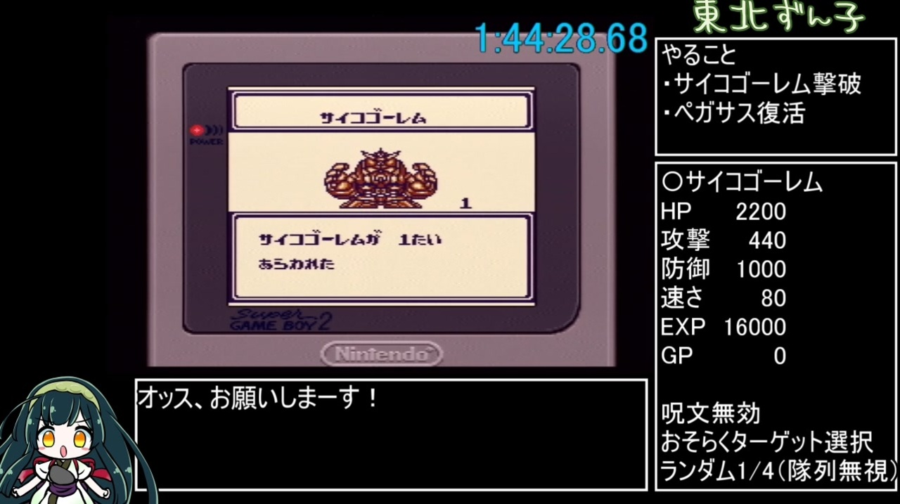 <span style="color: #111111; font-size: 14px;">GBソフト「SDガンダム外伝 ラクロアンヒーローズ」のバグ技使用なしのRTAのPART3です。</span><br>三種の神器の一つ「力の盾」入手~サイコゴーレム撃破まで。<br><br>この世で一番サイコゴーレムと戦ってる人(多分)<br><a href="https://www.nicovideo.jp/watch/sm33139655" class="watch">sm33139655</a><br><br>無編集版<br><a href="https://www.youtube.com/watch?v=FcvbYwZcRxw" target="_blank" rel="noopener nofollow">https://www.youtube.com/watch?v=FcvbYwZcRxw</a><br><br>使用ソフト<br>・VOICEROID2(VOICEROID EX+ 東北ずん子)<br>・AVIUtil<br><br>訂正情報<br>・ダークナイトのEXP1400→1200<br>・けがをしらい→けがをしたい(もうちょっと内容確認して再エンコ版アップします)<br><br><span style="font-size: 14px;">投稿リンク → </span><a href="https://www.nicovideo.jp/series/432347" target="_blank" rel="noopener">series/432347</a><br>PART1リンク<span style="font-size: 14px;">→</span><span style="color: #006699; font-size: 14px;"><a href="https://www.nicovideo.jp/mylist/62480170" target="_blank" rel="noopener">mylist/62480170</a></span><br><br>計測区間:「NEWGAME」選択から「-おわり-」表示後キャラクターがフェードアウトするまで<br>プレイ環境:スーパーファミコン(後期生産版)+スーパーゲームボーイ2<br>コントローラ:連射なし<br>録画環境 :GV-USB2<br><br><a target="_blank" href="https://qa.nicovideo.jp/faq/show/19424?site_domain=default" style="font-size: 13px;color: #657586; text-decoration: underline; line-height: 1.4">この動画は投稿者によって修正されました</a>