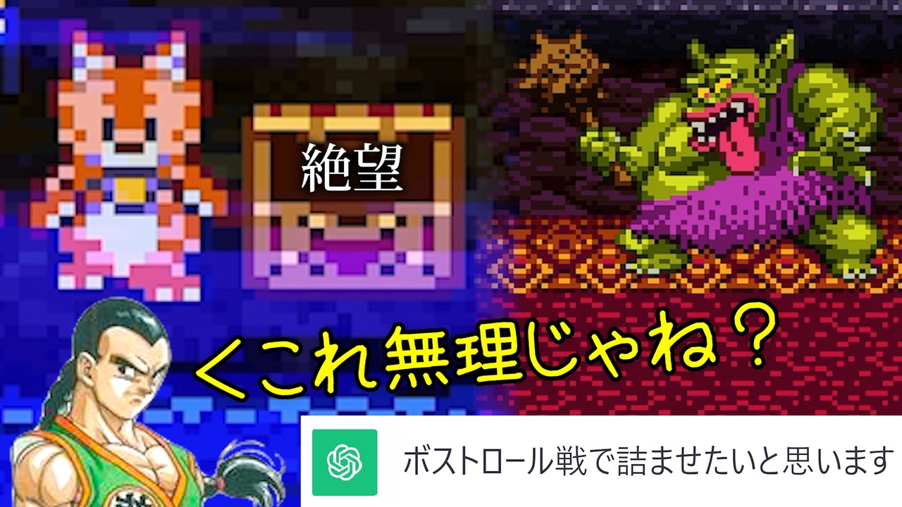 <br><strong>本当に意地悪ですね、GPTさん</strong><br><br><span style="color: #ff0000;">~基本ルール~-</span><br>①GPTは勇者を殺す為の行動を取る<br>②GPTは魔法使いのキャラとして作成し、その操作は<br>この全ルールを把握したchatGPTに都度聞いて任せる。<br>③GPTはわざと自殺・MP回復拒否するような行動は取れない<br>④GPTはパーティの1番前か1番後ろに配置させる<br>⑤GPTの持ち物や呪文はGPTの意思でしか移動・使用できない<br>⑥買い物時は全てプレイヤーの自由にできる<br>⑦リセットや、データを消去して1からやり直しても良い<br>⑧経験値を伴わない裏での金稼ぎ作業時のみルール全て例外とする<br><br><span style="color: #0000ff;">~禁じ手~</span><br>①操作キャラでGPTに危害を加える行為(危害=ダメージや悪い状態異常など)<br>※メダパニで混乱したせいで殴る、などは許される<br>②戦闘中にGPTが死んだ際に放置(その次のターン中に蘇生させなければいけない)<br>③戦闘開始or終了時にGPTが死んでいる<br>④GPTのMPが0か1の時にHP回復の選択(蘇生も)を<br>GPT以外のメンバーに対して取る ※宿屋系はOK<br>⑤GPT以外の仲間がマホカンタ状態になる<br>⑥GPTがいない状態で戦闘を開始or続けるor勝利(バシルーラ等でいなくなったら逃げる行動のみ可)<br><br><span style="color: #38761d;">勇者が死ぬ or 上記を破る度にGPTに強制リセット。「リセット」をする度にGPTに1pt。<br>50pt貯まったらGPTの勝ち。企画終了。</span><br><br><strong>【次】 下のシリーズから飛んでね<br>【part1】 <a href="https://www.nicovideo.jp/watch/sm42595666" class="watch">sm42595666</a> 【投稿動画まとめ】 <a href="https://www.nicovideo.jp/mylist/32090282" target="_blank" rel="noopener">mylist/32090282</a></strong><br><br><span style="color: red;"><strong>▼投稿者情報▼</strong></span><br>【 Twitter 】 <a href="https://twitter.com/wakou2525" target="_blank" rel="noopener nofollow">https://twitter.com/wakou2525</a><br>【生放送コミュ】 co1668349<br>【意見・連絡先】 wakou2525otayori@yahoo.co.jp