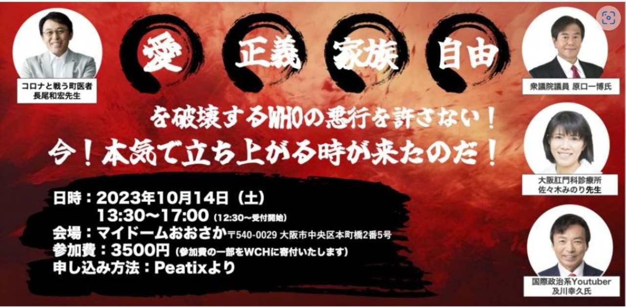 愛・正義・家族・自由をを破壊するWHOの悪行を許さない!<br><br>WHOの国際保健規則 IHR の書き換えが目前に迫っています。<br>これに飲み込まれてしまうと日本という国は本当になくなります。<br><br>WCHの大規模講演会がマイドームおおさかで行われました。1300名収容の会場は満席、会場は熱気に包まれていました。それほどまでに関心は高いのです。<br>録画禁止の講演会でしたが、録画許可されてからの部分を投稿します。<br>佐々木みのり先生、長尾和宏先生、衆議院議員原口一博先生、司会の及川幸久さんの言葉を聞いてください。<br><br>もう草の根運動の域を超えていると思いたいですが、まだまだです!残念ながら何も知らない人の方がはるかに多い!<br>長尾先生の言葉<br>「このまま何もしなければ大げさでなくこの国はなくなる」<br>もうそこまで来ています。<br>WCHをWHOに勝る組織にしていくために!これをご覧になった方は、まずWCHのホームページに行き、会員登録をお願いします!<br>ボランティア、寄附も受け付けています!<br><br>ワールドカウンシルフォーヘルスジャパン(WCHJ) (wch-japan.org)<br>