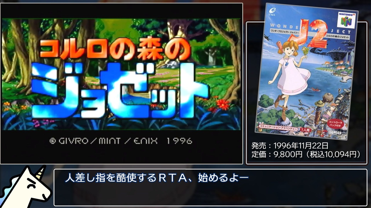 RTA第11弾は1996年発売、ギブロ(旧:アルマニック)開発。<br>ニンテンドウ64のコミュニケーション・アドベンチャー『ワンダープロジェクトJ2 コルロの森のジョゼット 』です。<br><br>公式ガイドブック(攻略本)はシステム解説がメイン。攻略サイトはフワッとした内容しかなかったため、自力調査&完全オリジナルチャートとなりました。<br>他に走っている人は探しても見当たらなかったので(多分)世界一位です。<br><br>先生……PCのフリーズが頻発し始めて辛いです……。<br>買い換える余裕もないのでどうしたものか。<br><br>前作【PC】大航海時代Ⅲ 奴隷貿易RTA]→<a href="https://www.nicovideo.jp/watch/sm42595837" class="watch">sm42595837</a><br>part.2→<a href="https://www.nicovideo.jp/watch/sm42990737" class="watch">sm42990737</a>(11/6 21:00公開)。進捗はTwitter(現:X)@Nagisa381rtaで<br><br>走ったRTAのpart.1まとめ→<a href="https://www.nicovideo.jp/mylist/73222388" target="_blank" rel="noopener">mylist/73222388</a><br>RTA全部まとめ→<a href="https://www.nicovideo.jp/mylist/72786007" target="_blank" rel="noopener">mylist/72786007</a><br><br><u>▽レギュレーション</u><br>タイマー開始:メッセージスピード&バードスピードの画面で『はい』を押した瞬間<br>タイマー終了:エンディングで『終わり』の文字が表示されきった瞬間<br>*今走では連射機は使用していません。ですが腱鞘炎になる(なった)ので使用可とします。<br><br><u>▽縛り</u>(これはレギュレーションに含まない)<br>○ジョゼットを故障させずにクリア<br>○できるだけ隠す<br><br>〇Twitter(現:X)→@Nagisa381rta<br><br>〇Youtubeでも活動しているのでチャンネル登録よろしくです<br>→<a href="https://www.youtube.com/channel/UCTNItIdl_gYr9N2j0PO-82g" target="_blank" rel="noopener nofollow">https://www.youtube.com/channel/UCTNItIdl_gYr9N2j0PO-82g</a><br><br>〇欲しいものリスト<br>→<a href="https://www.amazon.jp/hz/wishlist/ls/1S72L30BVRILK?ref_=wl_share" target="_blank" rel="noopener nofollow">https://www.amazon.jp/hz/wishlist/ls/1S72L30BVRILK?ref_=wl_share</a><br><br>〇今までの調査結果や攻略法をまとめた個人wiki(矛盾)を作りました<br>→<a href="https://w.atwiki.jp/nagisa381rta/" target="_blank" rel="noopener nofollow">https://w.atwiki.jp/nagisa381rta/</a><br><br>――――――――――――権利表記――――――――――――<br>© SQUARE ENIX<br><br><a target="_blank" href="https://qa.nicovideo.jp/faq/show/19424?site_domain=default" style="font-size: 13px;color: #657586; text-decoration: underline; line-height: 1.4">この動画は投稿者によって修正されました</a>