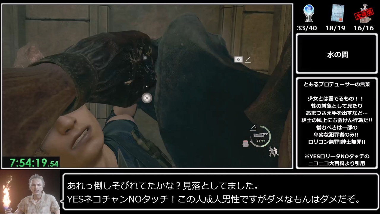 エイダ編やってたら予約投稿忘れてました<br><br>3周目チャプター7~3周目チャプター10舞踏場前まで<br><br>前→<a href="https://www.nicovideo.jp/watch/sm42881951" class="watch">sm42881951</a><br>次→<a href="https://www.nicovideo.jp/watch/sm42926079" class="watch">sm42926079</a><br><br>(追記)<br>金の聖猫像の最高値間違えてました<br>誤:青黄+赤の3カラーズ45,500ptas<br>正:黄黄+赤のデュオ45,600ptas<br>毎度毎度解説ガバ申し訳ありません。先駆者様のチャートで勉強し直します。<br><br>無編集版:<a href="https://youtu.be/6jxyTYf90BY" target="_blank" rel="noopener nofollow">https://youtu.be/6jxyTYf90BY</a><br>※録画時にOBSでタイマーをつけてるので、タイマーありますが無編集です<br><br>【使用機種】<br>・PS5<br><br>【計測区間】<br>・1周目難易度選択~右上にトロフィー「なけるぜ」取得ダイヤログが出た瞬間まで<br>※SEPARATE WAYS配信前のRTAです。SEPARATE WAYSのトロフィーを含みません。<br><br>【レギュ】<br>・壁抜け系バグ無し<br>・DLCなし(マーセナリーズ込み)<br>・チャーム無し<br>・コスチューム、アクセサリーは解放したら使ってOK<br><br>【諸注意】<br>・ゆっくりがしゃべります<br>・これ以降ずっとガバガバです<br>・編集で改善してほしい点があったら教えてね<br><br><br>