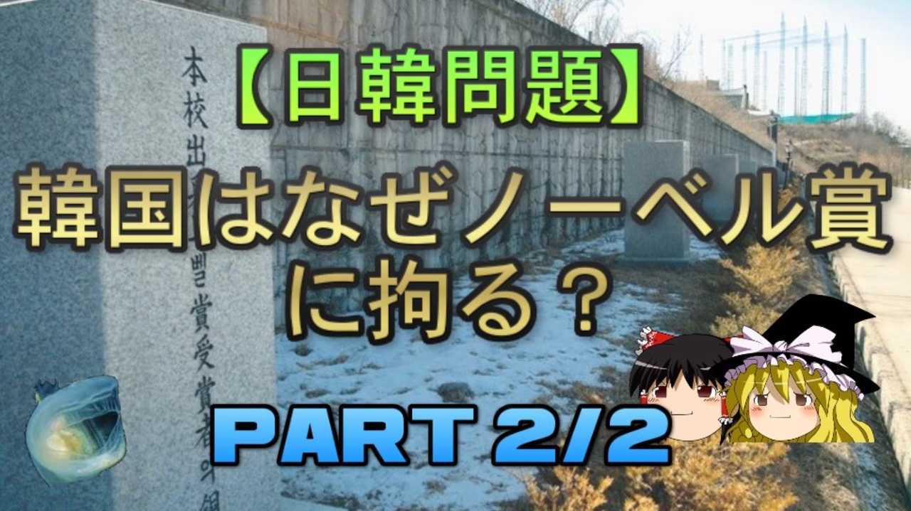 さて、本日は前回に引き続き韓国がノーベル賞にこだわる理由について扱っていきます。<br>秋が深まったのできっとどようび<br>本日のブログ記事<br><a href="https://oogchib.hateblo.jp/entry/2023/10/22/205424" target="_blank" rel="noopener nofollow">https://oogchib.hateblo.jp/entry/2023/10/22/205424</a><br><br>関連動画<br>【日韓問題】韓国とノーベル賞<br><a href="https://www.nicovideo.jp/watch/sm33977216" class="watch">sm33977216</a><br>【ゆっくり解説】韓国社会と外華内貧<br><a href="https://www.nicovideo.jp/watch/sm37546154" class="watch">sm37546154</a><br>【日韓問題】韓国独特の「ウリ」と「ナム」の概念 前編<br><a href="https://www.nicovideo.jp/watch/sm31815129" class="watch">sm31815129</a><br>【日韓問題】ヒロアカ問題と韓国の甲質(カプチル) part2/2<br><a href="https://www.nicovideo.jp/watch/sm36405931" class="watch">sm36405931</a><br><br>注意<br>・この動画は「日韓の価値観の違い」を扱っています<br><br>・うp主のスタンスは「価値観に善悪や優劣は存在しない」というものです<br><br>・相手が不法を働いているからとこちらが不法をして良い理由にはなりません<br><br>・自身の常識が相手にとっても常識とは限りません、「他者がそれを見たら<br>どう思うか」という客観性を常に持ちましょう。<br><br>・日常生活で注意する程度には言動に注意を心がけてください<br><br>・リクエストは原則受け付けていません<br><br>・引用ソースへのリンクが同時掲載のブログにあります<br><br>・毎週日曜日更新<br><br>引用ソースと動画のテキストをブログ日韓問題(初心者向け)のほうへ掲載しています。<br><br>日韓問題(初心者向け)<br><a href="https://oogchib.hateblo.jp/" target="_blank" rel="noopener nofollow">https://oogchib.hateblo.jp/</a><br><br>暇つぶしにどうぞ<br><a href="http://ooguchib.blog.fc2.com/" target="_blank" rel="noopener nofollow">http://ooguchib.blog.fc2.com/</a> <br><br>twitter @ooguchib<br><a href="https://twitter.com/ooguchib" target="_blank" rel="noopener nofollow">https://twitter.com/ooguchib</a><br><br>前 <a href="https://www.nicovideo.jp/watch/sm42893357" class="watch">sm42893357</a> <a href="https://www.nicovideo.jp/mylist/59069876" target="_blank" rel="noopener">mylist/59069876</a> 次 <a href="https://www.nicovideo.jp/watch/sm42955970" class="watch">sm42955970</a><br><br>番外編マイリスト<br><a href="https://www.nicovideo.jp/mylist/62992608" target="_blank" rel="noopener">mylist/62992608</a><br><br>YouTube版<br><a href="https://youtu.be/vZOal8SaSg4" target="_blank" rel="noopener nofollow">https://youtu.be/vZOal8SaSg4</a><br><br>