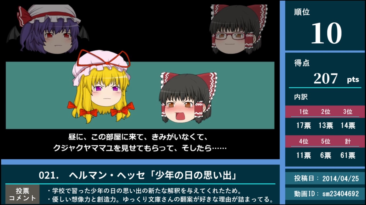 ゆっくり文庫様(<a href="https://www.nicovideo.jp/user/98118466" target="_blank" rel="noopener">user/98118466</a>)の動画シリーズが2023年10月22日に投稿開始10周年を<br>迎えることを記念して、過去動画を対象にした人気投票企画を実施しました。<br>ここでは51位~1位までを紹介していきます。<br><br>前編(121位~51位)⇒<a href="https://www.nicovideo.jp/watch/sm42918371" class="watch">sm42918371</a><br><br>■投票期間:2023年9月1日~2023年9月30日<br>■投票対象:No.1~No.121までの121作品(文庫リスペクト動画は対象外)<br>■投票方法:好きな作品を1作品~5作品まで順番を付けて投票<br>(googleフォームを使用。任意でコメントも受付)<br>■集計方法:投票順に5pt~1ptまでポイントを振り分けて作品ごとに得点を集計<br>(同点の場合、得票数が多いほうが上位。得票数も同数の場合は、同率順位) <br>■投票数等:参加者673名、有効投票数3,322票、コメント1,581個<br><br><br>※※※全投票コメント公開のお知らせ※※※<br>今回の総選挙で寄せられたすべての投票コメントを後日googleスプレッドシートで公開しました。<br>スプレッドシートURL:<a href="https://tinyurl.com/ynl89fz3" target="_blank" rel="noopener nofollow">https://tinyurl.com/ynl89fz3</a>