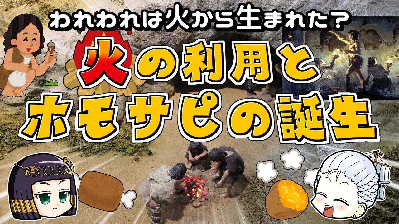 マリーはサピエンスに疑問を持ったようです。<br>現代でも生き残っている唯一の人類種、ホモ・サピエンス。<br>私たちが生き残れたのはなんのおかげ?知能?コミュ力?確かにね。<br><br>でも、それらを生み出したのは「火」だったのかもしれない…<br><br>↓↓↓会員専用チャンネル「ヒストリカの離宮」もよろよろー<br>新動画「古代アルプス殺人事件」はちょっと今回と連動してます。<br><a href="https://ch.nicovideo.jp/mond-historica" target="_blank" rel="noopener nofollow">https://ch.nicovideo.jp/mond-historica</a><br><br><br>今回の参考文献:<br>コーディー・キャシディー(2021)『人類の歴史をつくった17の大発見』梶山あゆみ訳 河出書房新社<br>篠田謙一(2022)『人類の起源』中央公論新社<br>古川恒介(2021)『エネルギーをめぐる旅━文明の歴史と私たちの未来』英治出版<br>左巻健男(2021)『絶対に面白い化学入門 世界史は化学でできている』ダイヤモンド社<br><br>その他 Wikipediaなど<br />━━━━━━━━━━━━━━━━━━━━━<br><br>この動画はクリエイティブ・コモンズ継承(CC-BY-SA)ライセンスの素材を使用して制作しています。(<a href="https://creativecommons.org/licenses/by-sa/4.0/)" target="_blank" rel="noopener nofollow">https://creativecommons.org/licenses/by-sa/4.0/)</a><br>規約に基づき、この動画もCC-BY-SA 4.0 のもとで公開します。<br><br>投稿者共通情報☆彡<br><br>BGM, SE:ニコニ・コモンズ様<br><a href="http://commons.nicovideo.jp/" target="_blank" rel="noopener nofollow">http://commons.nicovideo.jp/</a><br>魔王魂様<br><a href="https://maoudamashii.jokersounds.com/" target="_blank" rel="noopener nofollow">https://maoudamashii.jokersounds.com/</a><br>Audiostock様<br><a href="https://audiostock.jp/" target="_blank" rel="noopener nofollow">https://audiostock.jp/</a><br><br>立ち絵 霊夢・魔理沙(黒子式):nicotalk様<br><a href="http://www.nicotalk.com/charasozai.html" target="_blank" rel="noopener nofollow">http://www.nicotalk.com/charasozai.html</a><br><br>立ち絵 パトラ、マリー、アン、メアリ:ライフライフ様<br><a href="https://0801lifelife.tumblr.com/" target="_blank" rel="noopener nofollow">https://0801lifelife.tumblr.com/</a><br><br>使用ツール1:ゆっくりムービーメーカー4<br><a href="https://manjubox.net/ymm4/" target="_blank" rel="noopener nofollow">https://manjubox.net/ymm4/</a><br><br>使用ツール2:AviUtl<br><a href="http://spring-fragrance.mints.ne.jp/aviutl/" target="_blank" rel="noopener nofollow">http://spring-fragrance.mints.ne.jp/aviutl/</a><br><br>各時代の地図 : World History Maps & Timelines <br><a href="http://geacron.com/home-en/" target="_blank" rel="noopener nofollow">http://geacron.com/home-en/</a><br><br>ゆっくりボイスについて:AquesTalkライセンス取得済み<br><br>キャラクターボイス<br>アン・ボニー:羽ノ華(A.I.VOICE)<br>メアリ・リード:琴葉 葵(A.I.VOICE)<br>クレオパトラ:結月ゆかり(VOICEROID2)<br>マリー‐アントワネット:東北きりたん (VOICEROID EX)<br>その他キャラ:青山龍星(A.I.VOICE)、伊織弓鶴(A.I.VOICE2)、栗田まろん(A.I.VOICE)、宮舞モカ(VOICEPEAK)、フリモメン(VOICEPEAK)<br><br><br><br>その他フリー素材ご提供元の皆様に圧倒的感謝<br>