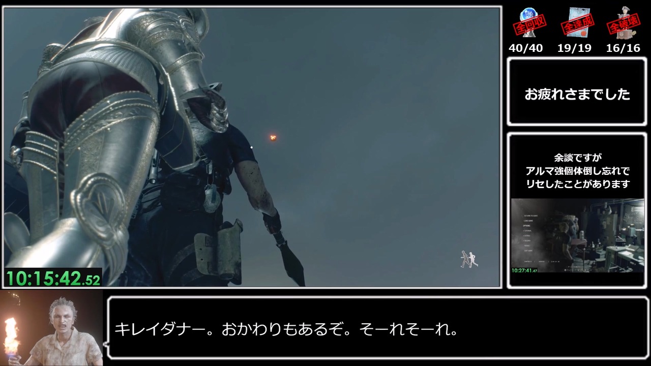 終わり!閉廷!<br><br>3周目チャプター14クラウザー戦~エンディングまで<br><br>前→<a href="https://www.nicovideo.jp/watch/sm42926079" class="watch">sm42926079</a><br><br>無編集版:<a href="https://youtu.be/6jxyTYf90BY" target="_blank" rel="noopener nofollow">https://youtu.be/6jxyTYf90BY</a><br>※録画時にOBSでタイマーをつけてるので、タイマーありますが無編集です<br><br>【使用機種】<br>・PS5<br><br>【計測区間】<br>・1周目難易度選択~右上にトロフィー「なけるぜ」取得ダイヤログが出た瞬間まで<br>※SEPARATE WAYS配信前のRTAです。SEPARATE WAYSのトロフィーを含みません。<br><br>【レギュ】<br>・壁抜け系バグ無し<br>・DLCなし(マーセナリーズ込み)<br>・チャーム無し<br>・コスチューム、アクセサリーは解放したら使ってOK<br><br>【諸注意】<br>・ゆっくりがしゃべります<br>・これ以降ずっとガバガバです<br>・編集で改善してほしい点があったら教えてね<br><span style="color: #efefef;">・エイダ編はIGT1時間切れたら作るかもしれません</span>