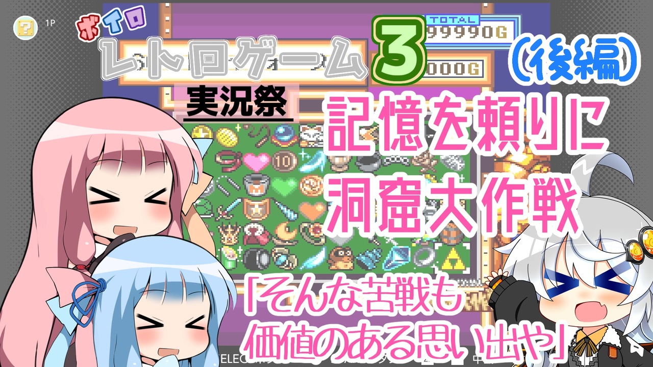 "ボイロレトロゲーム実況祭3"参加動画……の後編です。<br>お宝と一緒に、沢山の忘れかけた思い出も見つかりました。<br><br>趣旨:攻略を見ず、リアルタイムで遊んでいた頃の記憶を頼りにお宝コンプ<br><br>前編:<a href="https://www.nicovideo.jp/watch/sm42946983" class="watch">sm42946983</a><br><br>Terraria → 【<a href="https://www.nicovideo.jp/mylist/64460335" target="_blank" rel="noopener">mylist/64460335</a>】<br>7 Days to Die(α20) → 【<a href="https://www.nicovideo.jp/mylist/72531669" target="_blank" rel="noopener">mylist/72531669</a>】<br>Splatoon3 → 【<a href="https://www.nicovideo.jp/mylist/74704258" target="_blank" rel="noopener">mylist/74704258</a><br>その他VOICEROID実況 Part1集 → 【<a href="https://www.nicovideo.jp/mylist/64379408" target="_blank" rel="noopener">mylist/64379408</a>】<br>SCPゆっくり解説 → 【<a href="https://www.nicovideo.jp/mylist/54980618" target="_blank" rel="noopener">mylist/54980618</a>】