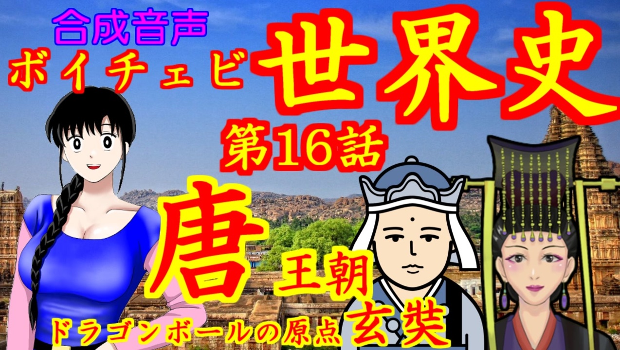 日テレ系「まんが日本史」をオマージュし、<br>学習漫画「世界の歴史」を教科書とした<br>ボイチェビ世界史 第16回は、<br>古代中国の、唐王朝 および周辺各国です。<br><br>「歴史学者・ことりさん」が、<br>no.7(voicevox)の声でご案内いたします。<br>※登場人物にも声を用意します。<br><br>注意点<br>・セリフは、その一部は教科書など参考文献から<br>引用させていただくことがあります。<br>・演出のために、舞台の時代にそぐわない画像や<br>音楽を使う場合がございます。<br>・セリフ発声はすべて合成音声<br>・BGMは、他者作成のBGMや音楽を借ります。<br>・若干の表記ゆれはご容赦ください。<br>・親作品は動画最後のスタッフロール画面に掲載します。<br><br>みどころ<br>1:50 貞観の治をもたらした、李世民が即位<br><a href="https://www.nicovideo.jp/watch/sm42955614?from=110" target="_blank" rel="noopener nofollow">https://www.nicovideo.jp/watch/sm42955614?from=110</a><br><br>7:43 玄奘、ナーランダー僧院に到着<br><a href="https://www.nicovideo.jp/watch/sm42955614?from=463" target="_blank" rel="noopener nofollow">https://www.nicovideo.jp/watch/sm42955614?from=463</a><br><br>12:04 則天武后、唐王朝の権力を握る<br><a href="https://www.nicovideo.jp/watch/sm42955614?from=724" target="_blank" rel="noopener nofollow">https://www.nicovideo.jp/watch/sm42955614?from=724</a><br><br>13:43 玄奘、大般若経を梵字から漢語へ翻訳完了<br><a href="https://www.nicovideo.jp/watch/sm42955614?from=823" target="_blank" rel="noopener nofollow">https://www.nicovideo.jp/watch/sm42955614?from=823</a><br><br><a target="_blank" href="https://qa.nicovideo.jp/faq/show/19424?site_domain=default" style="font-size: 13px;color: #657586; text-decoration: underline; line-height: 1.4">この動画は投稿者によって修正されました</a>