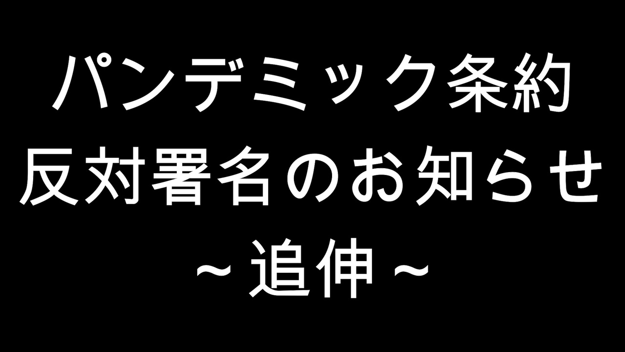 WHOの「パンデミック条約」に、断固反対します!<br>日本政府に、パンデミック条約に調印しないことを求めます!<br>~「日本国憲法」・「基本的人権」・「自由」を守るための署名運動~<br><a href="https://voice.charity/events/592" target="_blank" rel="noopener nofollow">https://voice.charity/events/592</a><br>原口一博<br><a href="https://twitter.com/kharaguchi/status/1718514536922357951" target="_blank" rel="noopener nofollow">https://twitter.com/kharaguchi/status/1718514536922357951</a><br>日本ラエリアン・ムーブメント<br><a href="https://www.ufolove.jp/%E3%83%AF%E3%82%AF%E3%83%81%E3%83%B3%E3%81%AE%E5%8D%B1%E9%99%BA%E7%90%86%E7%94%B1" target="_blank" rel="noopener nofollow">https://www.ufolove.jp/%E3%83%AF%E3%82%AF%E3%83%81%E3%83%B3%E3%81%AE%E5%8D%B1%E9%99%BA%E7%90%86%E7%94%B1</a><br>緊急声明:WCHJの名前を使った署名・募金活動について<br><a href="https://wch-japan.org/?p=1849" target="_blank" rel="noopener nofollow">https://wch-japan.org/?p=1849</a><br>高橋清隆<br><a href="https://twitter.com/anti_journalism/status/1718301501758861689" target="_blank" rel="noopener nofollow">https://twitter.com/anti_journalism/status/1718301501758861689</a><br>ラビ#ラン<br><a href="https://twitter.com/rabiraelian" target="_blank" rel="noopener nofollow">https://twitter.com/rabiraelian</a><br>WCHJ<br><a href="https://wch-japan.org/" target="_blank" rel="noopener nofollow">https://wch-japan.org/</a><br>