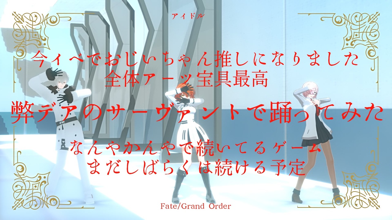 ※LB7までのストーリー/キャラネタバレあり<br>※真名/再臨ネタバレあり<br>※細かいこととマスターレベル高くないことは広い心で気にしないで<br><br>ハロウィンですね<br>全然ハロウィンじゃない動画ですがハッピーハロウィン<br><br>FGOは当初ハマってから何度か離脱したり戻ったりしながらずるずる続けてるゲームです<br>それはそうとカマソッソの実装はまだですか<br><br>こんな大人数動画やるの初めてなのであわわわわわわ<br>間違いあったら申し訳ありません<br><br>推しへの想いが抉れたらまたなんか作ります<br><br>お借りしたものは動画クレジットにて<br><br>過去作はこちら<br><a href="https://www.nicovideo.jp/user/5784796/series/337297" target="_blank" rel="noopener nofollow">https://www.nicovideo.jp/user/5784796/series/337297</a><br><br>何かありましたら<br>Twitter @re_world<br>Discord re_world<br>まで<br><br>------------------------------------------<br>原曲 アイドル<br>yoasobi様<br><a href="https://www.nicovideo.jp/watch/sm42070239" target="_blank" rel="noopener nofollow">https://www.nicovideo.jp/watch/sm42070239</a><br><br>振付<br>足太ぺんた様<br><a href="https://www.nicovideo.jp/watch/sm42106907" target="_blank" rel="noopener nofollow">https://www.nicovideo.jp/watch/sm42106907</a><br><br>モーション<br>たこはちP様<br><a href="https://www.nicovideo.jp/watch/sm42746265" target="_blank" rel="noopener nofollow">https://www.nicovideo.jp/watch/sm42746265</a><br>------------------------------------------<br>広告お礼<br><a href="https://termsofservice.blog.jp/archives/24556387.html" target="_blank" rel="noopener nofollow">https://termsofservice.blog.jp/archives/24556387.html</a><br><br>無断転載禁止、無断トレス&コピー禁止、AI学習機能の使用禁止<br>何かありましたらプロフィール欄の連絡先にお願いします<br>