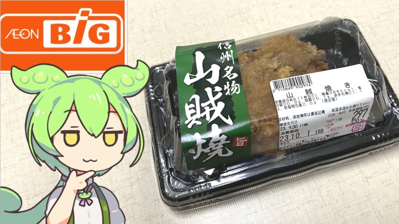 イオン系列の「ザ・ビッグ」にあった長野県の名物です。<br><br><br>【参考】<br>長野県で愛される山賊焼き でもなぜ揚げているのに焼きなの?(NHK長野放送局)<br><a href="https://www.nhk.or.jp/nagano/lreport/article/000/10/" target="_blank" rel="noopener nofollow">https://www.nhk.or.jp/nagano/lreport/article/000/10/</a><br>発見!ご当地「油」紀行 第35回長野県(松本市)山賊焼(日清オイリオ)<br><a href="https://www.nisshin-oillio.com/report/kikou/vol35.html" target="_blank" rel="noopener nofollow">https://www.nisshin-oillio.com/report/kikou/vol35.html</a><br>山賊焼き(塩尻市)<br><a href="https://www.city.shiojiri.lg.jp/site/shokuiku/3411.html" target="_blank" rel="noopener nofollow">https://www.city.shiojiri.lg.jp/site/shokuiku/3411.html</a><br>本郷鶏肉の山賊焼(信州松本本郷鶏肉)<br><a href="https://www.hongo-keiniku.co.jp/sanzoku_yaki/" target="_blank" rel="noopener nofollow">https://www.hongo-keiniku.co.jp/sanzoku_yaki/</a><br>堂々の1位獲得! 第1回 信州しおじりキャラクター総選挙 応援ありがとうございました!(PLUM)<br><a href="https://www.pmoa.co.jp/tandem/sara.html" target="_blank" rel="noopener nofollow">https://www.pmoa.co.jp/tandem/sara.html</a><br>ごゆっくり松本 城元三姉妹<br><a href="https://shiromoto3.com/" target="_blank" rel="noopener nofollow">https://shiromoto3.com/</a><br>長野中央警察署キャラクター紹介<br><a href="https://www.pref.nagano.lg.jp/police/keisatsusho/chuo/character/chara.html" target="_blank" rel="noopener nofollow">https://www.pref.nagano.lg.jp/police/keisatsusho/chuo/character/chara.html</a><br><br><br>【使用した素材】(※敬称略)<br>(合成音声)VOICEVOX/ずんだもん/四国めたん/<br><a href="https://voicevox.hiroshiba.jp/" target="_blank" rel="noopener nofollow">https://voicevox.hiroshiba.jp/</a><br>(立ち絵)坂本アヒル<br><a href="https://seiga.nicovideo.jp/seiga/im10788496" target="_blank" rel="noopener">im10788496</a>/<a href="https://seiga.nicovideo.jp/seiga/im10791276" target="_blank" rel="noopener">im10791276</a><br>(楽曲)甘茶の音楽工房/「楽しい麦畑」「お城の舞踏会」