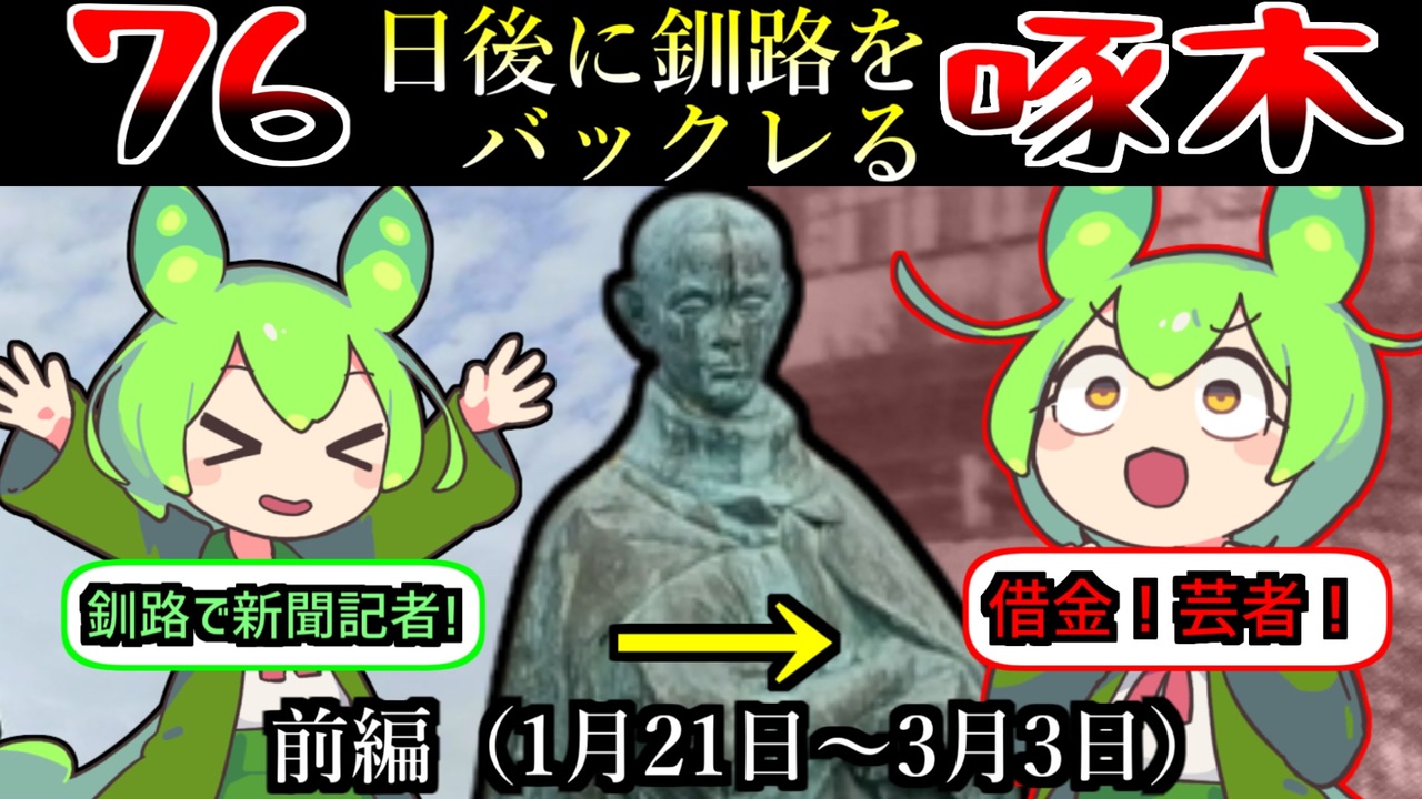 歌人・石川啄木は釧路で新聞記者として過ごしていた時代がありました<br><br>しかし啄木は、わずか76日間で釧路をバックレて逃げ出しています<br><br>いったい彼は釧路でどんな生活を送っていたのか?<br><br>誇張たっぷりに解説します<br><br><br><br><br>●参考資料<br><a href="http://takubokudiary.higoyomi.com/meiji41_1.htm" target="_blank" rel="noopener nofollow">http://takubokudiary.higoyomi.com/meiji41_1.htm</a><br><a href="https://kushiro-kobunkan.jimdofree.com/%EF%BC%92f-%E7%9F%B3%E5%B7%9D%E5%95%84%E6%9C%A8%E8%B3%87%E6%96%99%E9%A4%A8/%E5%95%84%E6%9C%A8%E3%81%A8%E9%87%A7%E8%B7%AF/" target="_blank" rel="noopener nofollow">https://kushiro-kobunkan.jimdofree.com/%EF%BC%92f-%E7%9F%B3%E5%B7%9D%E5%95%84%E6%9C%A8%E8%B3%87%E6%96%99%E9%A4%A8/%E5%95%84%E6%9C%A8%E3%81%A8%E9%87%A7%E8%B7%AF/</a><br><a href="http://ja.kushiro-lakeakan.com/overview/301/" target="_blank" rel="noopener nofollow">http://ja.kushiro-lakeakan.com/overview/301/</a><br><a href="https://ja.wikipedia.org/wiki/%E7%9F%B3%E5%B7%9D%E5%95%84%E6%9C%A8" target="_blank" rel="noopener nofollow">https://ja.wikipedia.org/wiki/%E7%9F%B3%E5%B7%9D%E5%95%84%E6%9C%A8</a><br><a href="https://core.ac.uk/download/pdf/230945212.pdf" target="_blank" rel="noopener nofollow">https://core.ac.uk/download/pdf/230945212.pdf</a><br><br><br><br>●音声ソフト<br>VOICEVOX:ずんだもん<br>VOICEVOX:四国めたん<br>VOICEVOX:春日部つむぎ<br>VOICEVOX:もち子(cv 明日葉よもぎ)<br>VOICEVOX:剣崎雌雄<br>VOICEVOX:麒ヶ島宗麟<br>VOICEVOX:玄野武宏(CV:ガロ)<br>VOICEVOX:栗田まろん<br>松嘩りすく@COEIROINK<br><br>●使用BGM<br>魔王魂<br><a href="https://maou.audio/" target="_blank" rel="noopener nofollow">https://maou.audio/</a><br><br>DOVA-SYNDROME<br><a href="https://dova-s.jp/" target="_blank" rel="noopener nofollow">https://dova-s.jp/</a><br><br><br>●X:<a href="https://twitter.com/acerola_vitamin" target="_blank" rel="noopener nofollow">https://twitter.com/acerola_vitamin</a><br><br>●釧路ブログ立ち上げました<br><a href="https://acerolalog.com/" target="_blank" rel="noopener nofollow">https://acerolalog.com/</a><br><br>●ほしいものリスト<br><a href="https://www.amazon.jp/hz/wishlist/ls/2OUUB1JQSRUWG?ref_=wl_share" target="_blank" rel="noopener nofollow">https://www.amazon.jp/hz/wishlist/ls/2OUUB1JQSRUWG?ref_=wl_share</a><br><br>#ずんだもん#VOICEROID解説#voicevox解説<br><br /><span style="color: #ff0000; font-size: 24px;"><strong>釧路を紹介するブログ始めました</strong></span>:<a href="https://946de2100.com" target="_blank" rel="noopener nofollow">https://946de2100.com</a><br><br><span style="color: #ff0000; font-size: 16px;"><strong>●おススメ動画:</strong></span><span style="color: #ff0000; font-size: 18px;"><strong>【歴史解説】かつて 釧路を支配していたのは佐賀だった ~釧路元町の始まりと佐野孫右衛門の盛衰~</strong></span><br><br><a href="https://www.nicovideo.jp/watch/sm44267722" class="watch">sm44267722</a><br><br><br><span style="color: #ff0000; font-size: 18px;"><strong>●YouTubeチャンネルも登録よろしくお願いします</strong></span><br><strong>釧路チャンネル <a href="https://www.youtube.com/@znd-kaisetu" target="_blank" rel="noopener nofollow">https://www.youtube.com/@znd-kaisetu</a></strong><br>恋結シラリカソロチャンネル <a href="https://www.youtube.com/@enmusubi-shirarika" target="_blank" rel="noopener nofollow">https://www.youtube.com/@enmusubi-shirarika</a><br><br><br>ほしいものリスト <a href="https://www.amazon.jp/hz/wishlist/ls/2OUUB1JQSRUWG?ref_=wl_share" target="_blank" rel="noopener nofollow">https://www.amazon.jp/hz/wishlist/ls/2OUUB1JQSRUWG?ref_=wl_share</a><br>クリエイターサポート<a href="https://creator-support.nicovideo.jp/registration/116665199" target="_blank" rel="noopener nofollow">https://creator-support.nicovideo.jp/registration/116665199</a><br><br><a target="_blank" href="https://qa.nicovideo.jp/faq/show/19424?site_domain=default" style="font-size: 13px;color: #657586; text-decoration: underline; line-height: 1.4">この動画は投稿者によって修正されました</a>