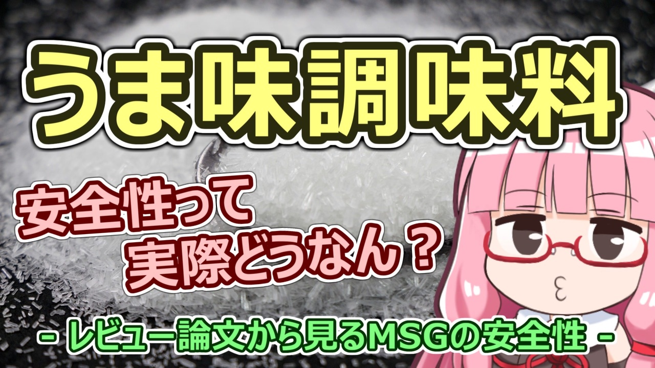 過去最長の動画にして過去最高に制作疲れました(慣れない解説動画)(専門外の分野)<br><br><br><strong>本動画はいわし@超ビビリ様主催の企画「解説動画投稿祭」の参加動画です。<br><br>【主催】<br>いわし@超ビビリ 様 → <a href="https://www.nicovideo.jp/user/15086302" target="_blank" rel="noopener">user/15086302</a><br>【告知動画】<br><a href="https://www.nicovideo.jp/watch/sm42715931" class="watch">sm42715931</a><br>【企画告知ページ】<br><a href="https://blog.nicovideo.jp/niconews/202077.html" target="_blank" rel="noopener nofollow">https://blog.nicovideo.jp/niconews/202077.html</a></strong><br><br><br>Youtube版 → <a href="https://youtu.be/RH-zaBH6EvQ" target="_blank" rel="noopener nofollow">https://youtu.be/RH-zaBH6EvQ</a><br><br><br>【参考リンク集】<br>・今回取り上げた論文<br>A. Zangfirescu et al.<br>"A review of the alleged health hazards of monosodium glutamate"<br><a href="https://www.ncbi.nlm.nih.gov/pmc/articles/PMC6952072/" target="_blank" rel="noopener nofollow">https://www.ncbi.nlm.nih.gov/pmc/articles/PMC6952072/</a><br>(動画内で紹介した各種研究のソースについてはこちらの論文のReferenceからご確認ください。)<br><br>・うま味調味料の製造方法について<br>Q. 味の素®の原材料は何?製法は?安全なの? | 味の素株式会社<br><a href="https://www.ajinomoto.co.jp/products/anzen/keyword/aji.html" target="_blank" rel="noopener nofollow">https://www.ajinomoto.co.jp/products/anzen/keyword/aji.html</a><br><br>・うま味調味料に含まれるMSGの量について(以下ページの情報をもとに算出)<br>味の素 商品ページ<br><a href="https://www.ajinomoto.co.jp/products/detail/?ProductName=ajinomoto" target="_blank" rel="noopener nofollow">https://www.ajinomoto.co.jp/products/detail/?ProductName=ajinomoto</a><br><br>・"化学調味料"の呼び名の由来について<br>「味の素®」は何故、むかし化学調味料と呼ばれたの? | ストーリー | 味の素グループ<br><a href="https://story.ajinomoto.co.jp/qa/016.html" target="_blank" rel="noopener nofollow">https://story.ajinomoto.co.jp/qa/016.html</a><br><br>・"よくない経路"でアルコールを摂取するとヤバい話の例(閲覧は一応自己責任で…)<br><a href="https://www.ncbi.nlm.nih.gov/pmc/articles/PMC4243473/" target="_blank" rel="noopener nofollow">https://www.ncbi.nlm.nih.gov/pmc/articles/PMC4243473/</a><br><a href="https://edition.cnn.com/2012/09/26/health/alcohol-enemas/index.html" target="_blank" rel="noopener nofollow">https://edition.cnn.com/2012/09/26/health/alcohol-enemas/index.html</a><br><a href="https://www.jstage.jst.go.jp/article/jaem/33/4/33_735/_pdf/-char/en" target="_blank" rel="noopener nofollow">https://www.jstage.jst.go.jp/article/jaem/33/4/33_735/_pdf/-char/en</a><br><br><br><br />--- 以下共通説明文 ---<br><br><br><span style="color: #ff0000; font-size: 18px;"><strong>ちくわかさんのSUZURIストア開設!!!</strong></span><br>以下URLから是非チェックしてください!!!<br><a href="https://suzuri.jp/tkwk_3" target="_blank" rel="noopener nofollow">https://suzuri.jp/tkwk_3</a><br><br><br><strong>NicoFTのパートナーパス販売開始しました!</strong><br><a href="https://nicoft.io/users/tkwk_3" target="_blank" rel="noopener nofollow">https://nicoft.io/users/tkwk_3</a><br><br>X(Twitter) → <a href="https://twitter.com/tkwk_3" target="_blank" rel="noopener nofollow">https://twitter.com/tkwk_3</a><br><br><br>飯作って食べるでシリーズ→ <a href="https://www.nicovideo.jp/series/279573" target="_blank" rel="noopener nofollow">https://www.nicovideo.jp/series/279573</a><br>企画参加等の料理単発系→ <a href="https://www.nicovideo.jp/series/284572" target="_blank" rel="noopener nofollow">https://www.nicovideo.jp/series/284572</a><br>あもあす動画 → <a href="https://www.nicovideo.jp/series/318162" target="_blank" rel="noopener nofollow">https://www.nicovideo.jp/series/318162</a><br>料理以外の動画→ <a href="https://www.nicovideo.jp/series/309010" target="_blank" rel="noopener nofollow">https://www.nicovideo.jp/series/309010</a><br><br><br>【コンテンツツリー外の素材サイト】<br>MusMus 様 → <a href="https://musmus.main.jp" target="_blank" rel="noopener nofollow">https://musmus.main.jp</a><br>効果音ラボ 様 → <a href="https://soundeffect-lab.info" target="_blank" rel="noopener nofollow">https://soundeffect-lab.info</a><br>いらすとや 様 → <a href="https://www.irasutoya.com/" target="_blank" rel="noopener nofollow">https://www.irasutoya.com/</a>
