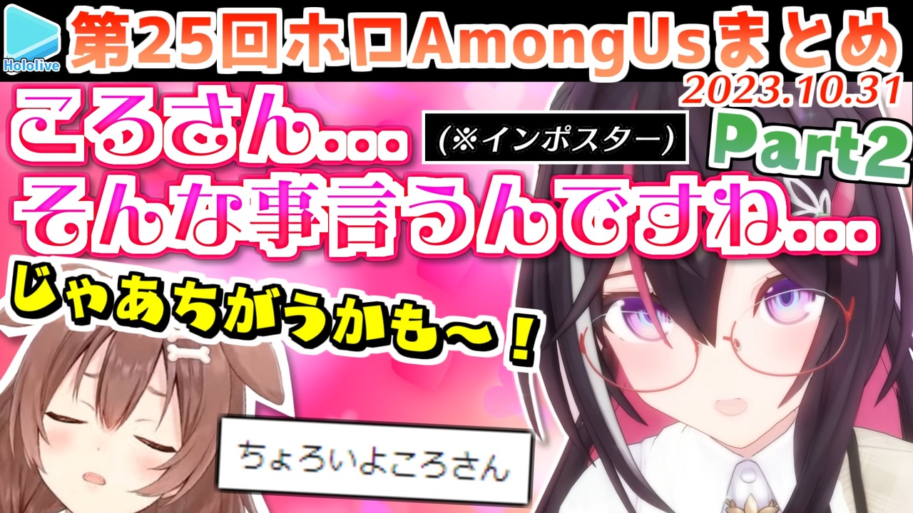 <a href="#" class="seekTime" data-seekTime="00:00" onclick="seekNicoPlayer('#00:00'); return false;">#00:00</a> 第5試合 みこ・AZKi<br><a href="#" class="seekTime" data-seekTime="12:07" onclick="seekNicoPlayer('#12:07'); return false;">#12:07</a> 第6試合 AZKi・ルイ<br><a href="#" class="seekTime" data-seekTime="25:59" onclick="seekNicoPlayer('#25:59'); return false;">#25:59</a> 第7試合 フブキ・ルイ<br><a href="#" class="seekTime" data-seekTime="37:23" onclick="seekNicoPlayer('#37:23'); return false;">#37:23</a> 第8試合 フブキ・ぼたん<br><br><br>元動画様はこちら<br>【#ホロハロウィンAmongUs】HalloweenにハチャメチャAmongUS【白上フブキ/ホロライブ】<br><a href="https://youtu.be/Bk8D4-Tt8SI" target="_blank" rel="noopener nofollow">https://youtu.be/Bk8D4-Tt8SI</a><br><br>【#ホロハロウィンAmongUs】殺戮の限り【ホロライブ/夏色まつり】<br><a href="https://youtu.be/CTRt7Zm_4aQ" target="_blank" rel="noopener nofollow">https://youtu.be/CTRt7Zm_4aQ</a><br><br>【 #ホロハロウィンAmongUs 】とりっくおあえりーとだにぇ!【ホロライブ/さくらみこ】<br><a href="https://youtu.be/_OAXTZLe-w4" target="_blank" rel="noopener nofollow">https://youtu.be/_OAXTZLe-w4</a><br><br>【ホロハロウィンAmongUs】ころね支店【戌神ころね/ホロライブ】<br><a href="https://youtu.be/2clXVgdYdSY" target="_blank" rel="noopener nofollow">https://youtu.be/2clXVgdYdSY</a><br><br>【 ホロハロウィンAmongUs 】AmongUs約3年ぶりで震えるぜぇ!【角巻わため/ホロライブ4期生】<br><a href="https://youtu.be/2gZgfwkd5QM" target="_blank" rel="noopener nofollow">https://youtu.be/2gZgfwkd5QM</a><br><br>【Among Us】今夜はハロウィン、何も起こらないはずがなく… ホロハロウィンAmongUs【獅白ぼたん/ホロライブ】<br><a href="https://youtu.be/Vnu4cBuI2EQ" target="_blank" rel="noopener nofollow">https://youtu.be/Vnu4cBuI2EQ</a><br><br>【ホロハロウィンAmongUs】トリック・オア・トリート!【ホロライブ / AZKi】<br><a href="https://youtu.be/4qWU_r1Rx8U" target="_blank" rel="noopener nofollow">https://youtu.be/4qWU_r1Rx8U</a><br><br>【 #ホロハロウィンAmongUs 】愉快な愉快なハロウィンパーティ。【鷹嶺ルイ/ホロライブ】<br><a href="https://youtu.be/uS9h9oY4IwE" target="_blank" rel="noopener nofollow">https://youtu.be/uS9h9oY4IwE</a><br><br>フブキCh。白上フブキ <a href="https://t.co/R9TNhC7sPO" target="_blank" rel="noopener nofollow">https://t.co/R9TNhC7sPO</a><br>Matsuri Channel 夏色まつり <a href="https://t.co/6IbKSqaxIW" target="_blank" rel="noopener nofollow">https://t.co/6IbKSqaxIW</a><br>Miko Ch. さくらみこ <a href="https://t.co/FM8eBkuiOO" target="_blank" rel="noopener nofollow">https://t.co/FM8eBkuiOO</a><br>Korone Ch. 戌神ころね <a href="https://t.co/qeTXwRU2F1" target="_blank" rel="noopener nofollow">https://t.co/qeTXwRU2F1</a><br>Watame Ch. 角巻わため <a href="https://t.co/gE06SdvpNX" target="_blank" rel="noopener nofollow">https://t.co/gE06SdvpNX</a><br>Botan Ch.獅白ぼたん <a href="https://t.co/IWecN1QB4o" target="_blank" rel="noopener nofollow">https://t.co/IWecN1QB4o</a><br>AZKi Channel <a href="https://t.co/yd3bObJi1O" target="_blank" rel="noopener nofollow">https://t.co/yd3bObJi1O</a><br>Lui ch. 鷹嶺ルイ - holoX - <a href="https://t.co/FT5ZgISmcf" target="_blank" rel="noopener nofollow">https://t.co/FT5ZgISmcf</a><br /><span style="color: #b7b7b7; font-size: 10px;">ホロライブ切り抜き/なめたけ <a href="https://t.co/CBwJLnYR2c" target="_blank" rel="noopener nofollow">https://t.co/CBwJLnYR2c</a></span>