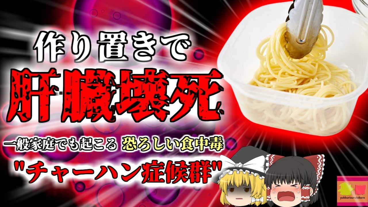 <a href="#" class="seekTime" data-seekTime="00:00" onclick="seekNicoPlayer('#00:00'); return false;">#00:00</a> 冒頭挨拶<br><a href="#" class="seekTime" data-seekTime="00:25" onclick="seekNicoPlayer('#00:25'); return false;">#00:25</a> 視聴上の注意<br><a href="#" class="seekTime" data-seekTime="1:20" onclick="seekNicoPlayer('#1:20'); return false;">#1:20</a> 本編開始<br><a href="#" class="seekTime" data-seekTime="2:03" onclick="seekNicoPlayer('#2:03'); return false;">#2:03</a> 作り置きのパスタ<br><a href="#" class="seekTime" data-seekTime="2:55" onclick="seekNicoPlayer('#2:55'); return false;">#2:55</a> 運動前に食べたトマトソース<br><a href="#" class="seekTime" data-seekTime="4:21" onclick="seekNicoPlayer('#4:21'); return false;">#4:21</a> 翌朝<br><a href="#" class="seekTime" data-seekTime="5:36" onclick="seekNicoPlayer('#5:36'); return false;">#5:36</a> 原因の調査<br><a href="#" class="seekTime" data-seekTime="5:58" onclick="seekNicoPlayer('#5:58'); return false;">#5:58</a> 肝臓<br><a href="#" class="seekTime" data-seekTime="7:08" onclick="seekNicoPlayer('#7:08'); return false;">#7:08</a> セレウス菌<br><a href="#" class="seekTime" data-seekTime="9:55" onclick="seekNicoPlayer('#9:55'); return false;">#9:55</a> "チャーハン症候群"とも呼ばれていた<br><a href="#" class="seekTime" data-seekTime="10:33" onclick="seekNicoPlayer('#10:33'); return false;">#10:33</a> 予防方法<br><br>今回紹介するのは、以前からリクエストがありました、セレウス菌食中毒の事例です。ベルギー王国在住の大学生「Aさん」はこの日、作り置きしていたパスタを夕食に食べ、スポーツの集まりへと出かけていました。<br>彼は日曜日になると、一週間分のパスタを茹で、それにソースをかけた物を小分けにし、冷蔵庫に保存する、といった所謂作り置きをしており、この日は5日前に作った、トマトソースのパスタを食べ、出かけていました。<br>しかし、三十分ほどが経過したころ。Aさんはこれまで体験したことのないほど、強烈な吐き気と腹痛に襲われ、自宅に引き返し、トイレに籠りました。<br>そして、その日は家で安静にし、そのまま眠りについて、自国は翌朝11時。<br>彼は実家で家族と暮らしていたため、母親は中々起きてこない息子を心配し、彼の部屋へと様子を見に行きますが、なんとAさんはベッドの上で冷たくなっており、この世を去った後でした。<br><br>その後の調査で、彼は肝臓の一部が壊4してしまっており、<br>それが原因で亡くなっていたことがわかりました。<br>更に彼の体、そして冷蔵庫に残されていたパスタからは、「セレウス菌」という細菌が検出され…<br><br />※この動画は過去の事件を知り、現在でも同じことが発生する危険性を再認識、関与しないように促すための動画であり、視聴者を扇動、動揺を誘うためのコンテンツではありません。<br><br>ご要望にお応えして、メンバーシップの開設を行いました。<br>下記URLからも登録可能ですので、ご興味がある方は是非ご参加ください。<br><a href="https://www.youtube.com/channel/UCcT5a1J7XJW7CLYI2RKl4pw/join" target="_blank" rel="noopener nofollow">https://www.youtube.com/channel/UCcT5a1J7XJW7CLYI2RKl4pw/join</a><br><br><br>Twitter<br>→<a href="https://twitter.com/yukkurisurutoko" target="_blank" rel="noopener nofollow">https://twitter.com/yukkurisurutoko</a><br><br>取り急ぎ、簡易的にですがマイリストを作りました。<br>【ゆっくり解説】事故・事件関係紹介リスト <br><a href="https://www.nicovideo.jp/mylist/71034319" target="_blank" rel="noopener nofollow">https://www.nicovideo.jp/mylist/71034319</a><br>【ゆっくり解説】放射線系事故<br><a href="https://www.nicovideo.jp/mylist/71034368" target="_blank" rel="noopener nofollow">https://www.nicovideo.jp/mylist/71034368</a><br>【ゆっくり解説】鉄道系事故・事件関連<br><a href="https://www.nicovideo.jp/mylist/71034379" target="_blank" rel="noopener nofollow">https://www.nicovideo.jp/mylist/71034379</a>