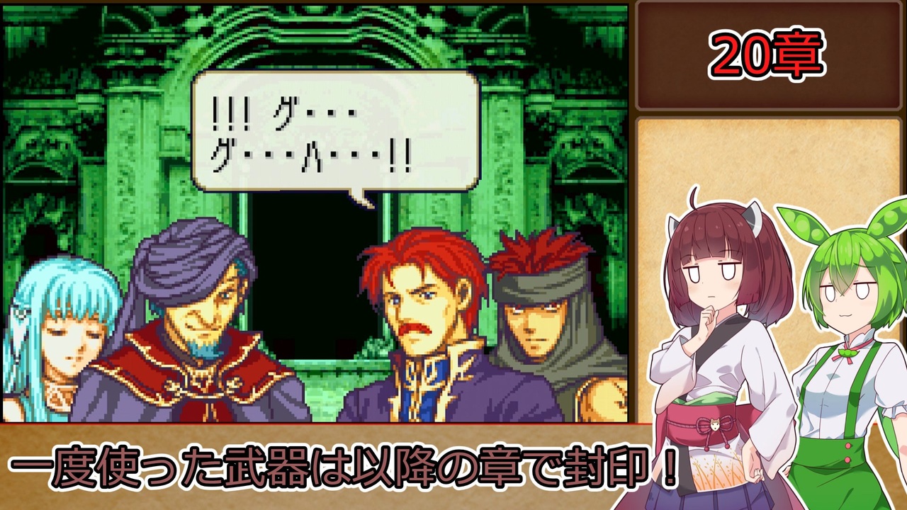 <span style="color: #85200c; font-size: 18px;"><strong><i>お待たせしました!<br>今週から再び週1回ペースで更新できると思います</i></strong></span><br><br><strong>ルール1:一度使用した武器種は、以降の章で使用する事を禁止する。<br>ルール2:武器の使用の定義は『その武器を装備した状態で敵との戦闘が発生したタイミング』『その武器を売却して換金した場合』杖の場合は『対象に対して使用した時点(命中の可否は問わない)』とする。</strong><br><span style="color: #ff0000;"><strong>※同盟軍、演出による戦闘イベントでは使用した判定にはならないこととする。</strong></span><br><strong>ルール3:難易度はリン編ハード→ヘクトル編ハードとする。<br>ルール4:序章から終章まで外伝、異伝を含む全ての章を攻略し、仲間に出来るユニットは全員加入させ、生存させる。(序章と1章のみ同一の章として扱う)</strong><br><span style="color: #ff0000; font-size: 18px;"><strong>※バグ技禁止</strong></span><br><br>本動画のシリーズリスト【<a href="https://www.nicovideo.jp/series/406473" target="_blank" rel="noopener">series/406473</a>】<br>前作の同縛りプレイ【<a href="https://www.nicovideo.jp/series/316824" target="_blank" rel="noopener">series/316824</a>】<br>前:【<a href="https://www.nicovideo.jp/watch/sm42913675" class="watch">sm42913675</a>】次:【<a href="https://www.nicovideo.jp/watch/sm43015329" class="watch">sm43015329</a>】<br><br><strong>使用したソフト</strong><br>VOICEROID+東北きりたんEX<br>VOICEPEAK 東北きりたん<br>VOICEPEAK ずんだもん<br><strong>お借りした素材</strong><br>ニコニコモンズの皆様(コンテンツツリー参照)