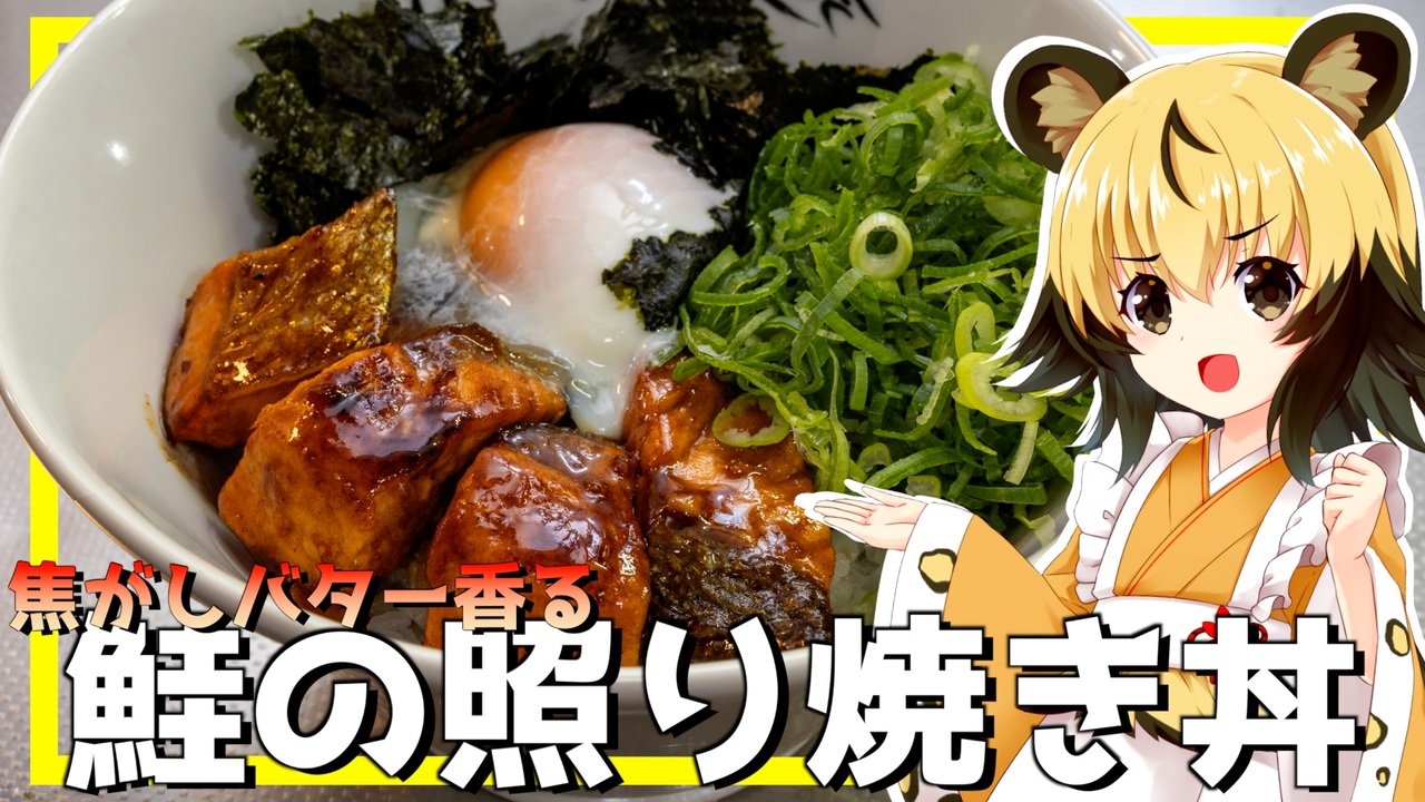 今回はちょっと濃いめのメニュー「焦がしバター香る!鮭の照り焼き丼」を作っていきましょう!<br><br>魚を使った焦がしバターが美味しいレシピです。<br>鮭が淡白なので、そこに焦がしバターの風味とコクがよく合いますよ。<br><br>卵黄ならコクUP!<br>温泉卵ならややさっぱりコクUPです!<br><br>海苔は韓国海苔にしても美味しいですよ<br><br><調理ポイント><br>1.鮭の塩分はお好みですが、塩鮭なら甘口がオススメ<br>2.焦がしすぎないように弱めの中火で<br>3.たっぷりネギを用意しましょう<br><br><br>■材料(1人分)<br>・鮭の切り身 1切れ<br>・塩 少々<br>・薄力粉 少々<br>・バター 10g<br>・砂糖 2〜3g<br>・小葱 たっぷり<br>・のり 適量<br>・卵 1個<br>※沸騰した鍋の火を消して卵を入れて13分で温泉卵の出来上がり<br>・ごはん 好きなだけ<br><br>たれ<br>・みりん 小さじ2<br>・醤油 小さじ2<br><br><br><br>■所要時間<br>作業時間:15分程度<br> (温泉卵同時並行で20分程度)<br><br>youtube:<a href="https://youtu.be/XdkepBQIBVw" target="_blank" rel="noopener nofollow">https://youtu.be/XdkepBQIBVw</a><br>twitter:@lycaon_kitchen<br><br>りおんの和風喫茶:<a href="https://www.nicovideo.jp/series/77190" target="_blank" rel="noopener">series/77190</a><br>おつかれごはん:<a href="https://www.nicovideo.jp/series/155690" target="_blank" rel="noopener">series/155690</a><br>手作り和菓子でちょっとひとやすみしませんか?:<a href="https://www.nicovideo.jp/series/155691" target="_blank" rel="noopener">series/155691</a><br><br>立ち絵:星華 彩二魔 様<br>イラスト:AWD kitchen<br>音源:DOVA-SYNDROME<br>音声:AI.VOICE 紲星あかり+ exVOICE