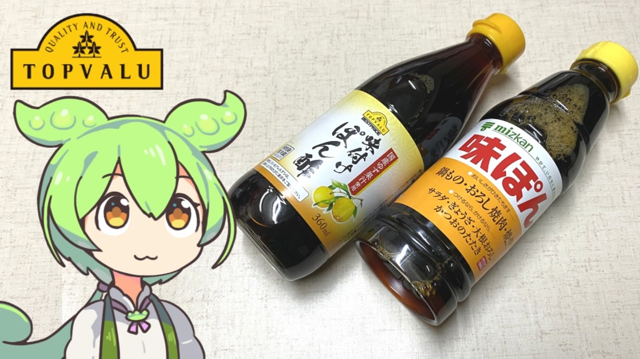 トップバリュのぽん酢です。<br><br><br>【参考】<br>味付けぽん酢(トップバリュ)<br><a href="https://www.topvalu.net/items/detail/4901810892129/" target="_blank" rel="noopener nofollow">https://www.topvalu.net/items/detail/4901810892129/</a><br>リサイクルペットボトルの安全性評価への挑戦。<br>調味料・食用油業界における環境に配慮した容器の使用推進を目指して。<br>(人事・事務のひらめきby BIGLOBE)<br><a href="https://news.biglobe.ne.jp/workstyle/0628/pts_230628_0466382782.html" target="_blank" rel="noopener nofollow">https://news.biglobe.ne.jp/workstyle/0628/pts_230628_0466382782.html</a><br>食品4社で調味料・食用油用リサイクルペットボトルの安全性評価(株式会社ミツカン)<br><a href="https://www.mizkan.co.jp/company/news/detail/220510-90.html" target="_blank" rel="noopener nofollow">https://www.mizkan.co.jp/company/news/detail/220510-90.html</a><br>味ぽん・味ぽんマイルド・味ぽんうまピリ・ゆずぽん・かおりの蔵丸搾りゆず<br>360ml製品がペットボトルになり、ラベルがはがしやすくなりました!<br>(株式会社ミツカン)<br><a href="https://faq.mizkan.co.jp/faq/show/6092?category_id=157&site_domain=default" target="_blank" rel="noopener nofollow">https://faq.mizkan.co.jp/faq/show/6092?category_id=157&site_domain=default</a><br>味ぽんの“ぽん”は何ですか?(株式会社ミツカン)<br><a href="https://faq.mizkan.co.jp/faq/show/2924?back=front%2Fcategory%3Ashow&category_id=160&page=1&site_domain=default&sort=sort_access&sort_order=desc" target="_blank" rel="noopener nofollow">https://faq.mizkan.co.jp/faq/show/2924?back=front%2Fcategory%3Ashow&category_id=160&page=1&site_domain=default&sort=sort_access&sort_order=desc</a><br>「たんぱく加水分解物」って何? Q&A(日本生協連安全政策推進室)<br><a href="https://jccu.coop/food-safety/qa/qa01_06.html" target="_blank" rel="noopener nofollow">https://jccu.coop/food-safety/qa/qa01_06.html</a><br><br><br>【使用した素材】(※敬称略)<br>(合成音声)VOICEVOX/ずんだもん/四国めたん/<br><a href="https://voicevox.hiroshiba.jp/" target="_blank" rel="noopener nofollow">https://voicevox.hiroshiba.jp/</a><br>(立ち絵)坂本アヒル<br><a href="https://seiga.nicovideo.jp/seiga/im10788496" target="_blank" rel="noopener">im10788496</a>/<a href="https://seiga.nicovideo.jp/seiga/im10791276" target="_blank" rel="noopener">im10791276</a><br>(楽曲)甘茶の音楽工房/「楽しい麦畑」