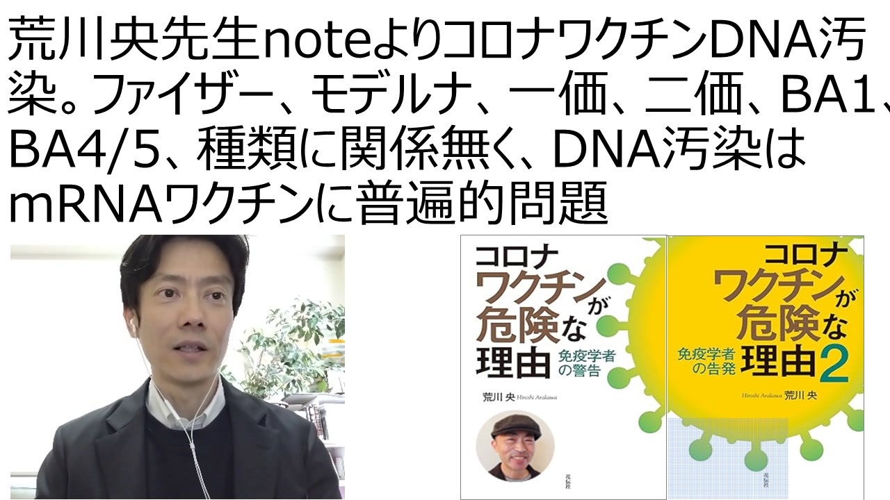 コロナワクチンの汚染DNAと有害事象 荒川央先生のnote<br><a href="https://note.com/hiroshi_arakawa/n/n0b024107a011?magazine_key=m57ee2fec0b39" target="_blank" rel="noopener nofollow">https://note.com/hiroshi_arakawa/n/n0b024107a011?magazine_key=m57ee2fec0b39</a><br><br>ロバート・ケネディ・ジュニア氏の暴露。ワープスピード作戦を率いたのはスパイ機関のNSAと国防総省。NIHがワクチンの特許の5割を保有。ワクチンは生物兵器!<br><a href="https://www.nicovideo.jp/watch/sm42439436" target="_blank" rel="noopener nofollow">https://www.nicovideo.jp/watch/sm42439436</a><br><br>ロバートケネディジュニア氏の動画<br> <a href="https://www.facebook.com/xxxxooooxxxxoooo/videos/188195087542081" target="_blank" rel="noopener nofollow">https://www.facebook.com/xxxxooooxxxxoooo/videos/188195087542081</a><br><br>Dr.苫米地 ヒトに初めて実用化接種されるmRNAワクチンとは(2021年3月1日放送)<br><a href="https://www.nicovideo.jp/watch/sm39208786" target="_blank" rel="noopener nofollow">https://www.nicovideo.jp/watch/sm39208786</a><br><br>Kevin McKernan(ケビン・マッカーナン)先生がコロナワクチンのDNA汚染を2023年の2月に初めて報告して以来、世界中の複数のラボから追試実験の報告が続いています。 汚染DNA量が多いロットでは明らかに有害事象の総数が多くなる傾向。汚染DNA量が多いほど重篤な有害事象が起きる割合も高くなります <br><br>ここで解析されたのは以下の12ロットのmRNAコロナワクチンから合計27バイアルです。<br>バイアルとは注射剤を入れるための容器で、ガラスもしくはプラスチックでできた瓶にゴムで栓をしたものを指す。微生物の侵入を防ぎ、無菌状態を保つことができる。<br> • モデルナ小児/成人用一価ワクチン (5ロット)<br> • モデルナ成人用BA4/5対応二価ワクチン (1ロット)<br> • モデルナ小児/成人用BA1対応二価ワクチン (1ロット)<br> • モデルナXBB1.5対応一価ワクチン (1ロット)<br> • ファイザー成人用一価ワクチン (3ロット)<br> • ファイザー成人用BA4/5対応二価ワクチン (1ロット)<br><br>真田信秋 日本国独立宣言論 私は独立を宣言する! キンドル出版<br><a href="https://www.amazon.co.jp/dp/B0CT86DX9G/" target="_blank" rel="noopener nofollow">https://www.amazon.co.jp/dp/B0CT86DX9G/</a><br>