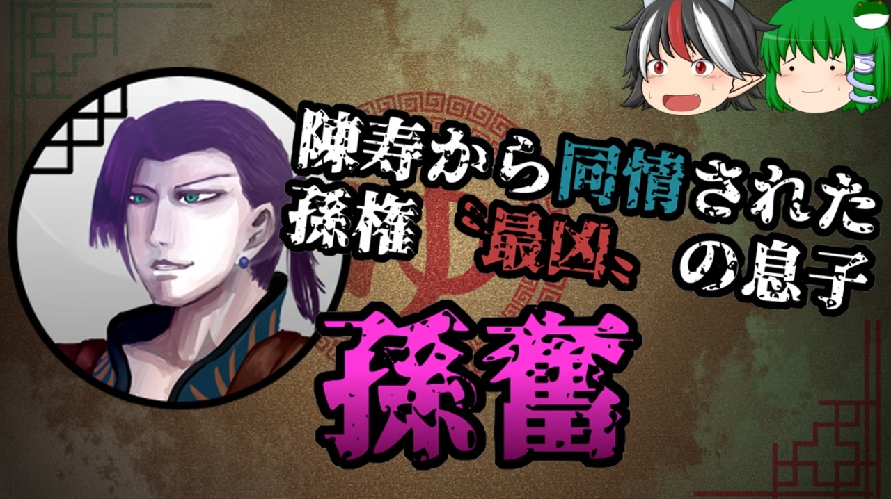 この動画は東方projectの二次創作です。AquesTalkライセンス購入済み。<br><br>◇反三国志二次創作同人誌「叔漢二國史」<br>冊子版 <a href="https://onl.sc/tKwXmmJ" target="_blank" rel="noopener nofollow">https://onl.sc/tKwXmmJ</a><br>電子書籍版 <a href="https://onl.sc/HAJFhCp" target="_blank" rel="noopener nofollow">https://onl.sc/HAJFhCp</a><br><br>三国志のメジャーではないけれど面白い人物や評価されるべき人物を紹介していきます。<br>孫権には七人の息子がいました。<br>ある者は皇太子として将来を嘱望されるも若くして亡くなり、ある者は孫呉最大のお家騒動によって破滅し、またある者は多くの権力者に翻弄されながらも皇帝に即位し……。<br>今回解説する孫奮は、そういった孫権の息子たちの中でも、上記のいずれにも当てはまらない特異な人物。しかしこの孫奮は、孫権の息子たちの中でも『最凶』を担う人物でした。<br><br>▷第六十回「王連」<a href="https://www.nicovideo.jp/watch/sm42886791" class="watch">sm42886791</a><br>▷第六十二回「宋建」<a href="https://www.nicovideo.jp/watch/sm43162405" class="watch">sm43162405</a><br><br>◆◆◆◆◆◆◆◆◆◆◆◆◆◆◆◆◆◆◆◆◆◆◆<br>参考文献、補足など<br>亶夏王朝府 <a href="https://danxiawangchao.hatenablog.com/" target="_blank" rel="noopener nofollow">https://danxiawangchao.hatenablog.com/</a><br>この動画の参考文献 <a href="https://danxiawangchao.hatenablog.com/entry/2023/11/15/225846" target="_blank" rel="noopener nofollow">https://danxiawangchao.hatenablog.com/entry/2023/11/15/225846</a><br><br>この動画のイラストまとめ<br>Pixiv <a href="https://www.pixiv.net/artworks/113435516" target="_blank" rel="noopener nofollow">https://www.pixiv.net/artworks/113435516</a><br>ニコニコ静画 <a href="https://seiga.nicovideo.jp/seiga/im11310176" target="_blank" rel="noopener">im11310176</a><br>BOOTH <a href="https://danxiawangchao.booth.pm/items/5256544" target="_blank" rel="noopener nofollow">https://danxiawangchao.booth.pm/items/5256544</a><br><br>YouTubeにもアップロードしています。よろしければ評価、チャンネル登録よろしくお願いします。<br><a href="https://youtu.be/0ruBUfyyRGs" target="_blank" rel="noopener nofollow">https://youtu.be/0ruBUfyyRGs</a><br>◆◆◆◆◆◆◆◆◆◆◆◆◆◆◆◆◆◆◆◆◆◆◆<br><br>音楽効果音提供<br>チンドン演歌/稿屋 隆 様<br>古びた工場/ラルスーン 様<br>カクカクの希望/今川彰人オーケストラ 様<br>8bit15 アジト/魔王魂 様<br>8bit19 おうけのせいいき/魔王魂 様<br>効果音提供/効果音ラボ 様<br>