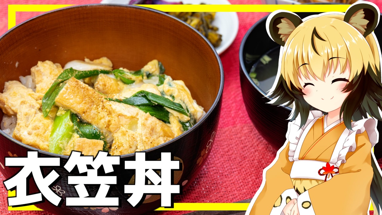 今回は京都の郷土料理「衣笠丼」を作っていきましょう!<br><br>衣笠丼は昔の天皇のお話をもとに作られたレシピで、<br>簡単に作れる、美味しいという事で<br>職人が仕事の合間にさっと食べれるということで広まったらしいです。<br><br>しっかり煮込んだ油揚げからは出汁が染み出してくるので<br>軽い食感ですが、とっても美味しい丼メニューですよ!<br><br><br><調理ポイント><br>1.出汁を染み込ませるために油揚げはしっかり油抜き<br>2.ネギは九条ネギがオススメ<br>3.山椒で香り高くいただきましょう<br><br><br>■材料(1人分)<br>・油揚げ 1/2枚<br>・ネギ 1/2本<br>・だし汁 100mL<br> (水90mL+白だし大さじ1)<br>・料理酒 大さじ1/2<br>・みりん 大さじ1/2<br>・醤油 小さじ2<br>・卵 1個<br>・山椒 お好みの量<br>・ごはん 好きなだけ<br><br><br>■所要時間<br>作業時間:10〜15分程度<br> (煮込み時間で変わります)<br><br>youtube:<a href="https://youtu.be/vLI-ziFezPI" target="_blank" rel="noopener nofollow">https://youtu.be/vLI-ziFezPI</a><br>twitter:@lycaon_kitchen<br><br>りおんの和風喫茶:<a href="https://www.nicovideo.jp/series/77190" target="_blank" rel="noopener">series/77190</a><br>おつかれごはん:<a href="https://www.nicovideo.jp/series/155690" target="_blank" rel="noopener">series/155690</a><br>手作り和菓子でちょっとひとやすみしませんか?:<a href="https://www.nicovideo.jp/series/155691" target="_blank" rel="noopener">series/155691</a><br><br>立ち絵:星華 彩二魔 様<br>イラスト:AWD kitchen<br>音源:DOVA-SYNDROME<br>音声:AI.VOICE 紲星あかり+ exVOICE
