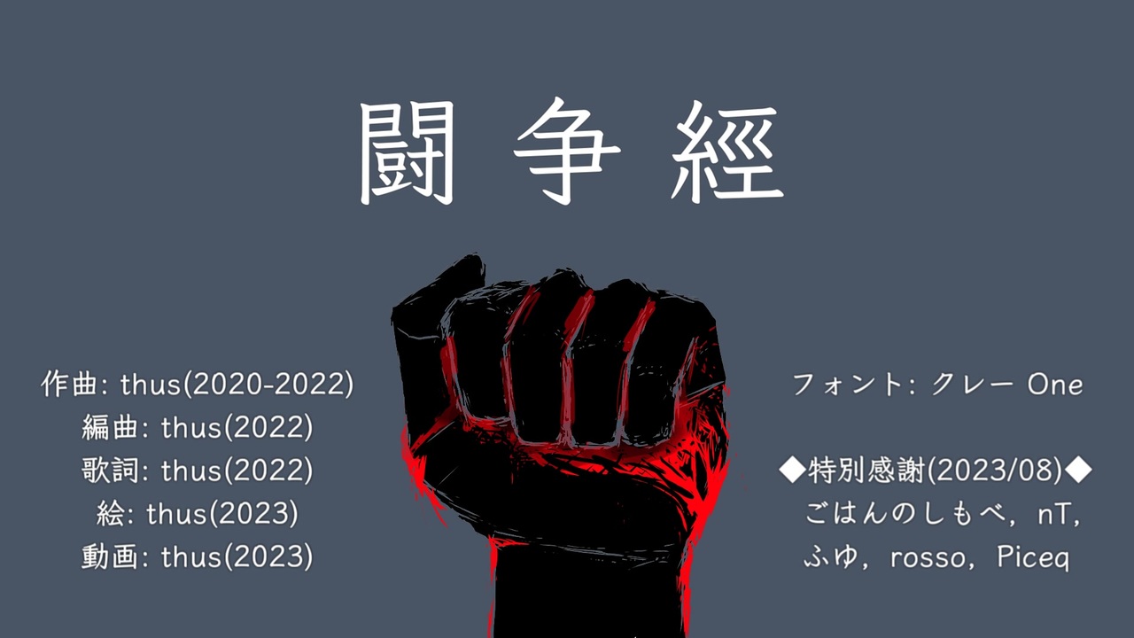 2022/09/27 17:41:「キネノベ大賞6」に応募用投稿<br>2023/09/03 00:56:2,525再生<br>2023/11/17:絵差替版予約投稿に伴って非公開化<br><br>―<br><br>2023/11/24:絵差替版で再投稿<br> どうも、戦闘狂のthusです。カラオケ動画:<a href="https://www.nicovideo.jp/watch/sm43033122" class="watch">sm43033122</a><br> 61-80のアルバム審査が自棄に遅いなァと思いながらも、愈々81-100のアルバムの制作も残り新曲を作るだけとなり佳境。その片手間に各音楽配信サイトでthusというアーティストが複数いたり、訳有って音楽配信代行業者を複数使っていることから業者ごとに別アーティスト扱いされていたりと、その修正手続きに追われ、そして新しい歌詞図書館を原状復帰させるために空いた時間に記事を書いたり、そして韓国語翻訳の監修で韓国語辞書・文法書を片手に翻訳をチェックしたりと、休息をとる為にアルバム制作に専念したはずが結局余裕が無くなって了うというのは、これはもう性かもしれません(Sagaではありません。それはロマンシングです。ゼノかもしれませんが)。<br> 原曲集アルバム制作は100迄で一旦止めて、81-100が終わったらオルゴール曲集のアルバムを出そうかと思っています。と或るファンの方とオルゴールアルバムを出すことを約束していたというのと、純粋に出したいというのと、人生で3番目に作った曲がこの文脈なら出せそうだからです。曲歌詞ともにできているのですが、初期で拙く音数も少ないことから、出すタイミングがもうないだろうと思っていましたが、オルゴールとしてしまえばその問題を解消できることに気づいたからです。作った曲は可能な限り公開したいものです。<br> 3月過ぎあたりから、(引退の意味ではなく、公開している曲数的に)現状最後に出せる原曲集アルバム101-120を作り出す予定ですが、もうどんな曲を作るかは今年の3月辺りからずっと考えていて、頭の中には既にある程度できている感じです。頑張ります。<br> 頑張りまァす。(っ'-')╮三●ブォン<br /><br><br><br>====================<br>| 2026/01/04 21:00「インスペクタの自死未遂」:<a href="https://www.nicovideo.jp/watch/sm45800854" class="watch">sm45800854</a><br>| 投稿曲マイリスト:<a href="https://www.nicovideo.jp/mylist/57867175" target="_blank" rel="noopener">mylist/57867175</a><br>|――――――――――――――――――<br>| pixivFANBOX:<a href="https://thus.fanbox.cc/" target="_blank" rel="noopener nofollow">https://thus.fanbox.cc/</a><br>| アルバム等配信中:<a href="https://thus-library.blogspot.com/search/label/discography" target="_blank" rel="noopener nofollow">https://thus-library.blogspot.com/search/label/discography</a><br>| つなぐ(依頼・リクエスト):<a href="https://tsunagu.cloud/users/thus" target="_blank" rel="noopener nofollow">https://tsunagu.cloud/users/thus</a><br>|――――――――――――――――――<br>| YouTube:<a href="https://youtube.com/@thus" target="_blank" rel="noopener nofollow">https://youtube.com/@thus</a><br>| X:<a href="https://x.com/thus_submission" target="_blank" rel="noopener nofollow">https://x.com/thus_submission</a><br>| 他全リンク:<a href="https://lit.link/thus" target="_blank" rel="noopener nofollow">https://lit.link/thus</a><br>|――――――――――――――――――<br>| オフボーカル等:<a href="https://piapro.jp/thus_999discommunication" target="_blank" rel="noopener nofollow">https://piapro.jp/thus_999discommunication</a><br>| 楽曲/動画の二次利用に関して:<a href="https://bit.ly/3JRQQiZ" target="_blank" rel="noopener nofollow">https://bit.ly/3JRQQiZ</a><br><span style="color: #262626;">| </span><span style="color: #262626;"><strong>歌詞図書館(ふりがな有るよ!):</strong></span><a href="https://thus-library.blogspot.com/" target="_blank" rel="noopener nofollow">https://thus-library.blogspot.com/</a><br>====================