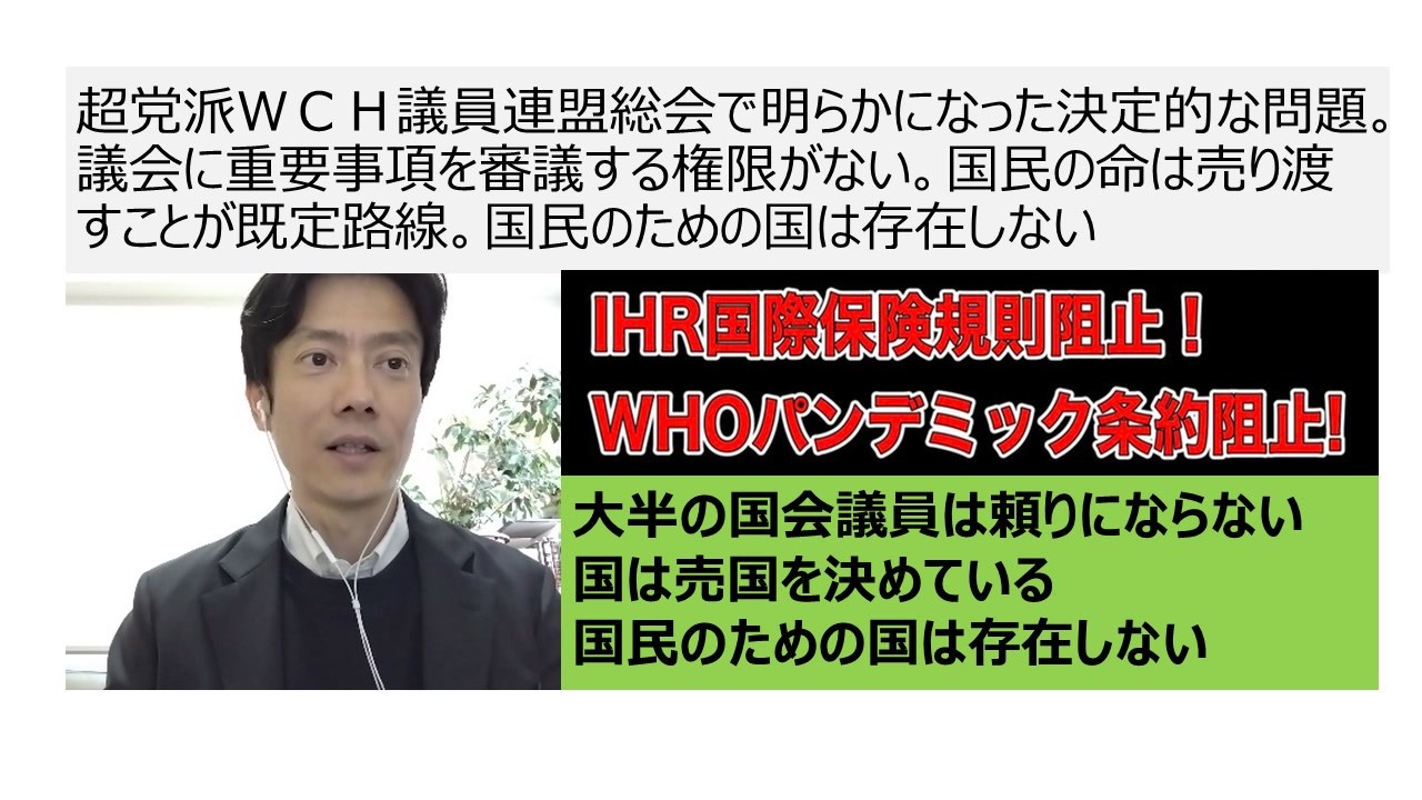 原口一博先生のチャンネル <br>WCH超党派議員連盟設立総会で出席議員への激励と感謝。そして、そこでわかったこと。<br><a href="https://live.nicovideo.jp/watch/lv343427619" target="_blank" rel="noopener nofollow">https://live.nicovideo.jp/watch/lv343427619</a><br><br>高橋清隆先生の文書館<br>「パンデミック条約」拒否できるか? 超党派議連が設立総会<br><a href="http://blog.livedoor.jp/donnjinngannbohnn/" target="_blank" rel="noopener nofollow">http://blog.livedoor.jp/donnjinngannbohnn/</a><br><br>2023.11.14【日本】WHOパンデミック条約の議論を日本の国会で【及川幸久−BREAKING−】<br><a href="https://www.youtube.com/watch?v=1lz2symgCBE&t=4s" target="_blank" rel="noopener nofollow">https://www.youtube.com/watch?v=1lz2symgCBE&t=4s</a><br><br>松木けんこう氏のサイト 他に同じ名前の議員さんいないですよね?<br><a href="https://kenko-matsuki.com/#philosophy" target="_blank" rel="noopener nofollow">https://kenko-matsuki.com/#philosophy</a><br><br>日本国独立宣言論 私は独立を宣言する! 真田信秋<br><a href="https://amzn.to/3D90lwx" target="_blank" rel="noopener nofollow">https://amzn.to/3D90lwx</a><br> <br>主権者命令書 主権破壊を許すな 売国傀儡日本政府を解体せよ<br><a href="https://amzn.to/49z51b5" target="_blank" rel="noopener nofollow">https://amzn.to/49z51b5</a><br> <br>マトリックス洗脳社会 グローバル企業ディストピア<br><a href="https://amzn.to/4g2YmZg" target="_blank" rel="noopener nofollow">https://amzn.to/4g2YmZg</a><br><br>メディア廃棄宣言 高橋清隆さん<br><a href="https://amzn.to/3BfdYKg" target="_blank" rel="noopener nofollow">https://amzn.to/3BfdYKg</a>