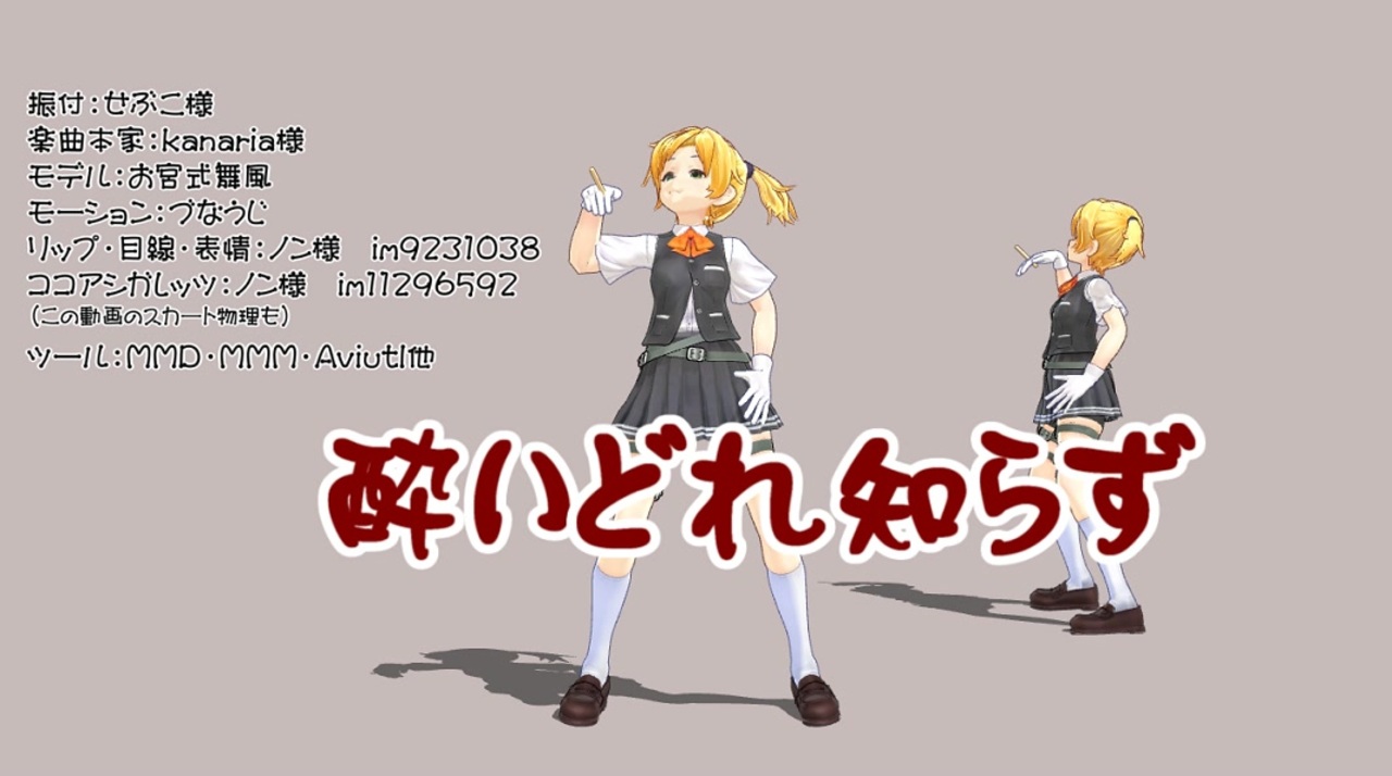 すばらしい楽曲、すばらしい振付と踊りに感謝します。<br>このモーションのご利用にあたっては、必ずreadmeをご一読ください。<br><br>モーション配布先:<a href="https://bowlroll.net/file/309779" target="_blank" rel="noopener nofollow">https://bowlroll.net/file/309779</a><br><br>振付:せぶこ様 <a href="https://www.nicovideo.jp/watch/sm40476758" target="_blank" rel="noopener nofollow">https://www.nicovideo.jp/watch/sm40476758</a><br>楽曲本家:kanaria様 <a href="https://www.nicovideo.jp/watch/sm40408445" target="_blank" rel="noopener nofollow">https://www.nicovideo.jp/watch/sm40408445</a><br>モデル:お宮式舞風 <a href="https://www.nicovideo.jp/watch/sm28414111" target="_blank" rel="noopener nofollow">https://www.nicovideo.jp/watch/sm28414111</a><br>モーション:づなうじ <a href="https://www.nicovideo.jp/watch/sm43034869" target="_blank" rel="noopener nofollow">https://www.nicovideo.jp/watch/sm43034869</a><br>リップ・目線・表情:ノン様 <a href="https://seiga.nicovideo.jp/seiga/im9231038" target="_blank" rel="noopener nofollow">https://seiga.nicovideo.jp/seiga/im9231038</a><br>ココアシガレッツ:ノン様 <a href="https://seiga.nicovideo.jp/seiga/im11296592" target="_blank" rel="noopener nofollow">https://seiga.nicovideo.jp/seiga/im11296592</a><br>ツール:MMD・MMM・Aviutl他<br><br>X(旧ツイッター):<a href="https://twitter.com/dunauzi" target="_blank" rel="noopener nofollow">https://twitter.com/dunauzi</a><br><br><a target="_blank" href="https://qa.nicovideo.jp/faq/show/19424?site_domain=default" style="font-size: 13px;color: #657586; text-decoration: underline; line-height: 1.4">この動画は投稿者によって修正されました</a>