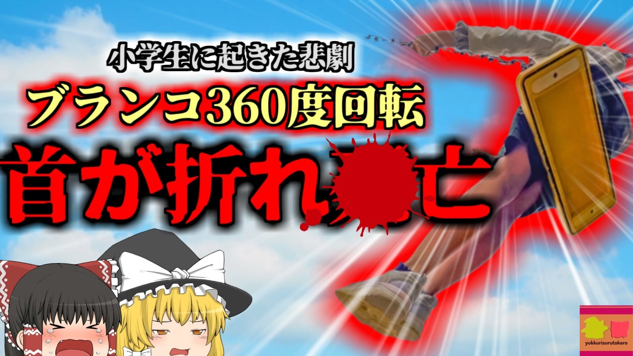 <a href="#" class="seekTime" data-seekTime="00:00" onclick="seekNicoPlayer('#00:00'); return false;">#00:00</a> 冒頭挨拶<br><a href="#" class="seekTime" data-seekTime="00:14" onclick="seekNicoPlayer('#00:14'); return false;">#00:14</a> 「遊具」<br><a href="#" class="seekTime" data-seekTime="1:52" onclick="seekNicoPlayer('#1:52'); return false;">#1:52</a> 視聴上の注意<br><a href="#" class="seekTime" data-seekTime="2:36" onclick="seekNicoPlayer('#2:36'); return false;">#2:36</a> 公園で遊んでいた「Aさん」<br><a href="#" class="seekTime" data-seekTime="4:27" onclick="seekNicoPlayer('#4:27'); return false;">#4:27</a> 360度回転<br><a href="#" class="seekTime" data-seekTime="6:16" onclick="seekNicoPlayer('#6:16'); return false;">#6:16</a> 原因の調査<br><a href="#" class="seekTime" data-seekTime="8:00" onclick="seekNicoPlayer('#8:00'); return false;">#8:00</a> 回転防止装置がなかった<br><a href="#" class="seekTime" data-seekTime="9:21" onclick="seekNicoPlayer('#9:21'); return false;">#9:21</a> 責任の所在と日本の判例<br><a href="#" class="seekTime" data-seekTime="12:14" onclick="seekNicoPlayer('#12:14'); return false;">#12:14</a> 減っていく遊具とその背景<br><br>今回紹介するのは、以前リクエストがありました、とある公園遊具に関する事例です。<br>ロシア連邦西部に位置するとある街の一角ではこの日、小学生男児の「Aさん」が、仲間たちと遊んでいました。<br>彼は放課後の夕方ごろ、仲間たちと地域の公園に集まり、いつも通りにボール遊びなどを楽しんでいました。<br>彼は公園の遊びの中でも、ブランコが特に好きだったそうで、Aさんは公園に到着するとすぐ、公園内に設置されていた、小型ブランコに飛び乗りました。<br>彼は座板の上に両足を乗せ、その上で屈伸するようにして勢いをつけ、なんとそのまま360度、一回転するという、危険な遊び方をしていました。<br>彼は一度ブランコを降り、仲間を集めてこの技を披露していましたが、彼は三回転技を決めた直後、身体が勢いよく前にはじき出され、Aさんの体は空中で2回転半し、その勢いのまま、公園のアスファルト床に激突。<br>彼は運悪く、頭から床に墜落しており、首が通常あり合えない方向へとまがり・・・<br><br><br />※この動画は過去の事件を知り、現在でも同じことが発生する危険性を再認識、関与しないように促すための動画であり、視聴者を扇動、動揺を誘うためのコンテンツではありません。<br><br>ご要望にお応えして、メンバーシップの開設を行いました。<br>下記URLからも登録可能ですので、ご興味がある方は是非ご参加ください。<br><a href="https://www.youtube.com/channel/UCcT5a1J7XJW7CLYI2RKl4pw/join" target="_blank" rel="noopener nofollow">https://www.youtube.com/channel/UCcT5a1J7XJW7CLYI2RKl4pw/join</a><br><br><br>Twitter<br>→<a href="https://twitter.com/yukkurisurutoko" target="_blank" rel="noopener nofollow">https://twitter.com/yukkurisurutoko</a><br><br>取り急ぎ、簡易的にですがマイリストを作りました。<br>【ゆっくり解説】事故・事件関係紹介リスト <br><a href="https://www.nicovideo.jp/mylist/71034319" target="_blank" rel="noopener nofollow">https://www.nicovideo.jp/mylist/71034319</a><br>【ゆっくり解説】放射線系事故<br><a href="https://www.nicovideo.jp/mylist/71034368" target="_blank" rel="noopener nofollow">https://www.nicovideo.jp/mylist/71034368</a><br>【ゆっくり解説】鉄道系事故・事件関連<br><a href="https://www.nicovideo.jp/mylist/71034379" target="_blank" rel="noopener nofollow">https://www.nicovideo.jp/mylist/71034379</a>