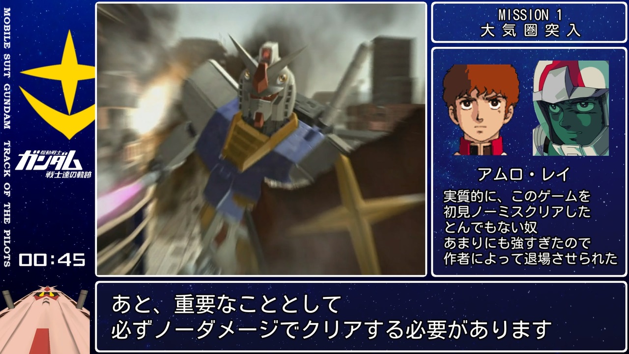 前世界記録(<a href="https://www.nicovideo.jp/watch/sm42162794" class="watch">sm42162794</a>)を17分40秒更新しました(計測地点を合わせて)。<br><br>あまりにも難しすぎて先駆者ですら達成していなかった<br>前人未到のノーミス、稼ぎなしで最後までクリアしました!<br>また、RTAで重要な仕様の発見や<br>無駄な指示、補給を徹底的に無くしてタイムを突き詰めました。<br><br>他の先駆者 <a href="https://www.nicovideo.jp/watch/sm39168341" class="watch">sm39168341</a>、<a href="https://www.nicovideo.jp/watch/sm40424568" class="watch">sm40424568</a><br><br>シャア編:<a href="https://www.nicovideo.jp/watch/sm43804800" class="watch">sm43804800</a><br>次:<a href="https://www.nicovideo.jp/watch/sm43142588" class="watch">sm43142588</a> 投稿動画 <a href="https://www.nicovideo.jp/mylist/35305526" target="_blank" rel="noopener">mylist/35305526</a><br><br>