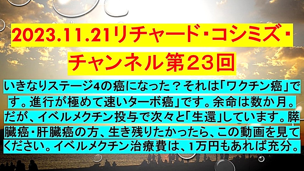 <span style="color: #ff0000;"><strong>「 いきなり『 ステージ4の癌 』になった?それは『 ワクチン癌 』です。進行が極めて速い『 ターボ癌 』<br> です。『 余命は数か月 』。だが、『 イベルメクチン投与 』で、次々と『 生還 』しています。『 膵臓<br> 癌・肝臓癌 』の方、生き残りたかったら、『 この動画 』を見て下さい。『 イベルメクチン治療費 』は、<br> 『 1万円 』もあれば『 充分 』です 」</strong></span><br><br><span style="color: #0000ff;"><strong>「『 イベルメクチン・アビガン・その他コロナ対策 』について、ご意見をお寄せ下さい! 」<br><br> ◐ E-mail:richardkoshimizu@gmail.com</strong></span><br><br><strong>◐「クリエイター・サポート」・「ニコニ広告」・「フォロー」等、ご協力の程宜しくお願い致します。RK</strong><br><br><span style="color: #38761d;"><strong>◐ リチャード・コシミズ 講演会 公式 動画ギャラリー</strong></span><br> <span style="color: #38761d;"><strong><a href="http://www.t-sskk.com/richardkoshimizu/video-gallery/index.html" target="_blank" rel="noopener nofollow">http://www.t-sskk.com/richardkoshimizu/video-gallery/index.html</a><br><br>◐ リチャード・コシミズ 講演会 『 ニコニコ生放送「 LIVE 」』</strong></span><br> <span style="color: #38761d;"><strong><a href="https://bit.ly/3Bx8F5w" target="_blank" rel="noopener nofollow">https://bit.ly/3Bx8F5w</a><br><br>◐ リチャード・コシミズ 『 ニコニコ チャンネル 』</strong></span><br> <span style="color: #38761d;"><strong><a href="https://ch.nicovideo.jp/richardkoshimizu" target="_blank" rel="noopener nofollow">https://ch.nicovideo.jp/richardkoshimizu</a><br><br>◐ リチャード・コシミズ 公式 ブログ</strong></span><br> <span style="color: #38761d;"><strong><a href="http://08054623210.jugem.jp/" target="_blank" rel="noopener nofollow">http://08054623210.jugem.jp/</a><br><br>◐ リチャード・コシミズ 公式 ホームページ</strong></span><br> <span style="color: #38761d;"><strong><a href="http://richardkoshimizu.boo.jp/" target="_blank" rel="noopener nofollow">http://richardkoshimizu.boo.jp/</a></strong></span><br>