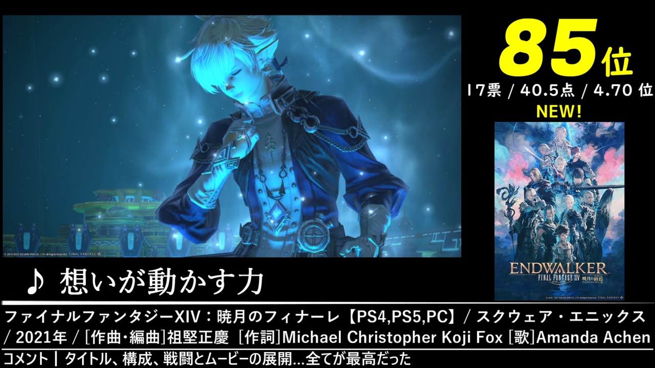 100位~75位の26曲を収録しています。<br>2022年5月1日~8月1日にかけて開催された「第15回みんなで決めるゲーム音楽ベスト100」の結果を動画化したものです。<span style="font-size: 10px;">集計人≠動画制作者</span><br><br><br>↓全体の結果はこちら↓<br><a href="https://w.atwiki.jp/gamemusicbest100/pages/9902.html" target="_blank" rel="noopener nofollow">https://w.atwiki.jp/gamemusicbest100/pages/9902.html</a><br><br><br>※収録時間が5分以上の楽曲です。<br><a href="#" class="seekTime" data-seekTime="83:42" onclick="seekNicoPlayer('#83:42'); return false;">#83:42</a>~<br><br><br>Part.36→<a href="https://www.nicovideo.jp/watch/sm43032989" class="watch">sm43032989</a><br>Part.38→<a href="https://www.nicovideo.jp/watch/sm43090844" class="watch">sm43090844</a><br>第15回まとめ→<a href="https://www.nicovideo.jp/mylist/74713060" target="_blank" rel="noopener">mylist/74713060</a><br><br><br>【ショートカット】<br>100位<a href="#" class="seekTime" data-seekTime="0:40" onclick="seekNicoPlayer('#0:40'); return false;">#0:40</a> / 99位<a href="#" class="seekTime" data-seekTime="5:19" onclick="seekNicoPlayer('#5:19'); return false;">#5:19</a>/ 98位<a href="#" class="seekTime" data-seekTime="9:10" onclick="seekNicoPlayer('#9:10'); return false;">#9:10</a> / 97位<a href="#" class="seekTime" data-seekTime="11:53" onclick="seekNicoPlayer('#11:53'); return false;">#11:53</a> / 96位<a href="#" class="seekTime" data-seekTime="14:22" onclick="seekNicoPlayer('#14:22'); return false;">#14:22</a> / 95位<a href="#" class="seekTime" data-seekTime="18:32" onclick="seekNicoPlayer('#18:32'); return false;">#18:32</a> / 94位<a href="#" class="seekTime" data-seekTime="20:45" onclick="seekNicoPlayer('#20:45'); return false;">#20:45</a> / 93位<a href="#" class="seekTime" data-seekTime="23:28" onclick="seekNicoPlayer('#23:28'); return false;">#23:28</a> / 92位<a href="#" class="seekTime" data-seekTime="27:57" onclick="seekNicoPlayer('#27:57'); return false;">#27:57</a> / 91位<a href="#" class="seekTime" data-seekTime="32:25" onclick="seekNicoPlayer('#32:25'); return false;">#32:25</a> / 90位<a href="#" class="seekTime" data-seekTime="34:45" onclick="seekNicoPlayer('#34:45'); return false;">#34:45</a> / 89位<a href="#" class="seekTime" data-seekTime="37:30" onclick="seekNicoPlayer('#37:30'); return false;">#37:30</a> / 88位<a href="#" class="seekTime" data-seekTime="40:45" onclick="seekNicoPlayer('#40:45'); return false;">#40:45</a> / 87位<a href="#" class="seekTime" data-seekTime="43:59" onclick="seekNicoPlayer('#43:59'); return false;">#43:59</a> / 86位<a href="#" class="seekTime" data-seekTime="47:31" onclick="seekNicoPlayer('#47:31'); return false;">#47:31</a> / 85位<a href="#" class="seekTime" data-seekTime="51:32" onclick="seekNicoPlayer('#51:32'); return false;">#51:32</a> / 84位<a href="#" class="seekTime" data-seekTime="54:21" onclick="seekNicoPlayer('#54:21'); return false;">#54:21</a> / 83位<a href="#" class="seekTime" data-seekTime="57:28" onclick="seekNicoPlayer('#57:28'); return false;">#57:28</a> / 82位<a href="#" class="seekTime" data-seekTime="61:19" onclick="seekNicoPlayer('#61:19'); return false;">#61:19</a> / 81位<a href="#" class="seekTime" data-seekTime="63:47" onclick="seekNicoPlayer('#63:47'); return false;">#63:47</a> / 80位<a href="#" class="seekTime" data-seekTime="67:15" onclick="seekNicoPlayer('#67:15'); return false;">#67:15</a> / 79位<a href="#" class="seekTime" data-seekTime="71:30" onclick="seekNicoPlayer('#71:30'); return false;">#71:30</a> / 78位<a href="#" class="seekTime" data-seekTime="74:11" onclick="seekNicoPlayer('#74:11'); return false;">#74:11</a> / 77位<a href="#" class="seekTime" data-seekTime="76:02" onclick="seekNicoPlayer('#76:02'); return false;">#76:02</a> / 76位<a href="#" class="seekTime" data-seekTime="80:27" onclick="seekNicoPlayer('#80:27'); return false;">#80:27</a> / 75位<a href="#" class="seekTime" data-seekTime="83:42" onclick="seekNicoPlayer('#83:42'); return false;">#83:42</a><br><br><a target="_blank" href="https://qa.nicovideo.jp/faq/show/19424?site_domain=default" style="font-size: 13px;color: #657586; text-decoration: underline; line-height: 1.4">この動画は投稿者によって修正されました</a>