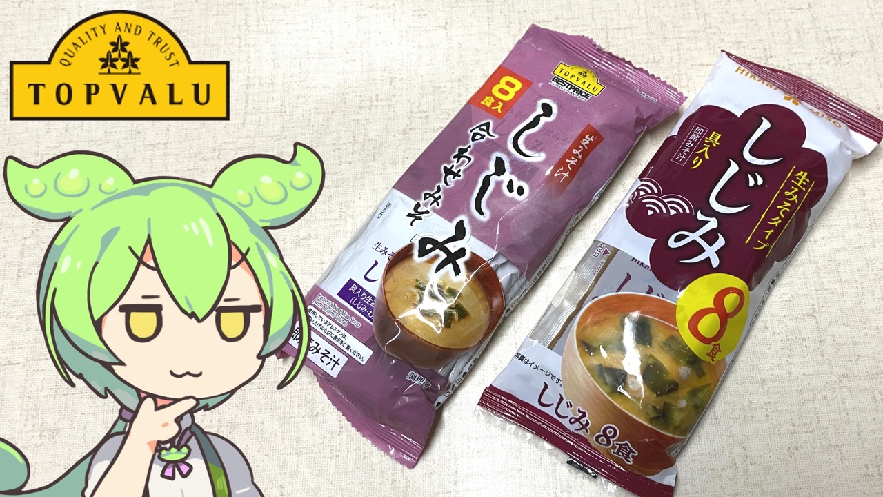 黄トプバのしじみのお味噌汁はなんと8食入りで57円です。<br><br><br>【関連動画】<br>トップバリュの黄色い味噌汁vs永谷園「あさげ」<br><a href="https://www.youtube.com/shorts/xua0Eosma94" target="_blank" rel="noopener nofollow">https://www.youtube.com/shorts/xua0Eosma94</a><br><br><br>【参考】<br>生みそ汁 しじみ(トップバリュ)<br><a href="https://www.topvalu.net/items/detail/4549414106350/" target="_blank" rel="noopener nofollow">https://www.topvalu.net/items/detail/4549414106350/</a><br>ひかり味噌株式会社<br><a href="https://www.hikarimiso.co.jp/" target="_blank" rel="noopener nofollow">https://www.hikarimiso.co.jp/</a><br>日本三大しじみ・涸沼(ひぬま)産やまとしじみを味わう!(鹿行ナビ)<br><a href="https://rokko-navi.media/gourmet/hinuma-shijimi/" target="_blank" rel="noopener nofollow">https://rokko-navi.media/gourmet/hinuma-shijimi/</a><br><br><br>【使用した素材】(※敬称略)<br>(合成音声)VOICEVOX/ずんだもん/四国めたん/春日部つむぎ<br><a href="https://voicevox.hiroshiba.jp/" target="_blank" rel="noopener nofollow">https://voicevox.hiroshiba.jp/</a><br>(立ち絵)坂本アヒル<br><a href="https://seiga.nicovideo.jp/seiga/im10788496" target="_blank" rel="noopener">im10788496</a>/<a href="https://seiga.nicovideo.jp/seiga/im10791276" target="_blank" rel="noopener">im10791276</a><br>(楽曲)甘茶の音楽工房/「楽しい麦畑」「フルーツパフェ」「お城の舞踏会」<br><a href="https://amachamusic.chagasi.com/" target="_blank" rel="noopener nofollow">https://amachamusic.chagasi.com/</a><br><br>