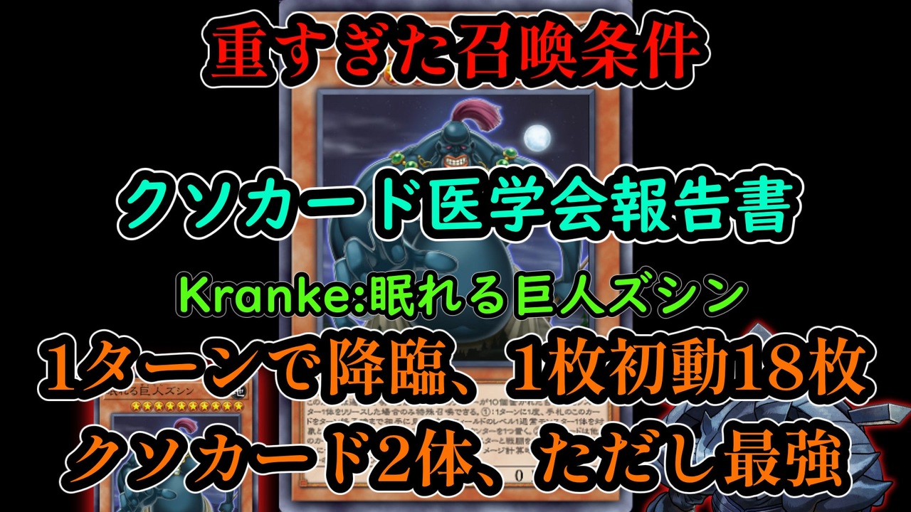 原作再現度100%、原作非再現度100%のカードの生み出す圧倒的シナジー<br>カジュアルで不快感無くまともに戦えるズシンデッキを目指しました<br>実戦動画の撮影は非公式クソカード医学会サーバーにて行われました。<br>対戦相手のmalcさん→<a href="https://www.nicovideo.jp/user/27415711" target="_blank" rel="noopener">user/27415711</a><br>月花見さんのジェットオーガを活かした寄生虫パラサイド治療→<a href="https://www.nicovideo.jp/watch/sm42974521" class="watch">sm42974521</a><br><br>展開にはまた謙虚なツモさんのダークドリアード7アドを大きく参考にさせてもらいました<br>→<a href="https://twitter.com/kennkyonatsumo/status/1703599813391225074" target="_blank" rel="noopener nofollow">https://twitter.com/kennkyonatsumo/status/1703599813391225074</a><br><br>非公式クソカード医学会サーバーは君達の知恵を欲しているぞ→<a href="https://discord.gg/pejHy5mQFT" target="_blank" rel="noopener nofollow">https://discord.gg/pejHy5mQFT</a><br>VOICEVOX:WhiteCUL<br><br>楽曲:『クリティウスの牙』<br>作曲:光宗 信吉<br>音源作成 the alternatively<br><a href="https://youtu.be/MmGIyia187s" target="_blank" rel="noopener nofollow">https://youtu.be/MmGIyia187s</a><br>本音源は下記サイトよりダウンロードできます。<br>(JASRAC信託楽曲につき有料会員の方のみダウンロード可能)<br>使用に関しての詳細はリンク先にてご確認ください。<br><a href="http://commons.nicovideo.jp/material/nc213572" target="_blank" rel="noopener nofollow">http://commons.nicovideo.jp/material/nc213572</a><br>アンチホープ絵:橋日露光<br><a href="https://twitter.com/camomile_357" target="_blank" rel="noopener nofollow">https://twitter.com/camomile_357</a><br><br><a target="_blank" href="https://qa.nicovideo.jp/faq/show/19424?site_domain=default" style="font-size: 13px;color: #657586; text-decoration: underline; line-height: 1.4">この動画は投稿者によって修正されました</a>