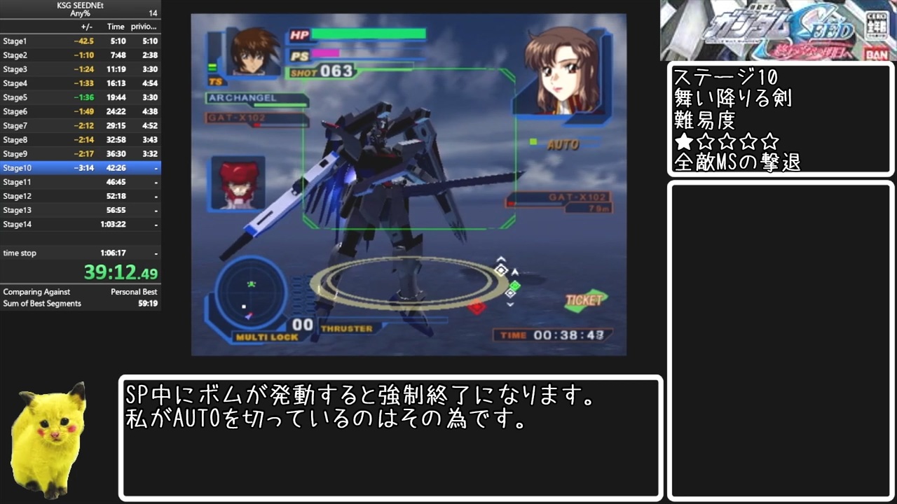 RTA第12弾はPS2 「機動戦士ガンダムSEED終わらない明日へ」です。<br>アツクナラナイデマケルワ<br><br>無編集版 <a href="https://youtu.be/1CG2kQu8UxU" target="_blank" rel="noopener nofollow">https://youtu.be/1CG2kQu8UxU</a><br>著作権の関係上EDを映していません。<br><br>説明文とか間違っている所を一部修正させていただきました。<br><br>プレイ環境<br>実機 SCPH-50000<br><br>録画環境<br>キャプチャ機器 GV-USB2 S端子<br>キャプチャソフト アマレコTV4.11<br>録画ソフト OBS30.0.0<br><br>前 <a href="https://www.nicovideo.jp/watch/sm43044844" class="watch">sm43044844</a><br>次 <a href="https://www.nicovideo.jp/watch/sm43100406" class="watch">sm43100406</a><br><br>今まで上げたRTA Part1リンク<a href="https://www.nicovideo.jp/mylist/71360071" target="_blank" rel="noopener">mylist/71360071</a><br><br>ガンダムゲーシリーズのRTA Part1リンク my/<a href="https://www.nicovideo.jp/mylist/73997183" target="_blank" rel="noopener">mylist/73997183</a><br><br><a target="_blank" href="https://qa.nicovideo.jp/faq/show/19424?site_domain=default" style="font-size: 13px;color: #657586; text-decoration: underline; line-height: 1.4">この動画は投稿者によって修正されました</a>