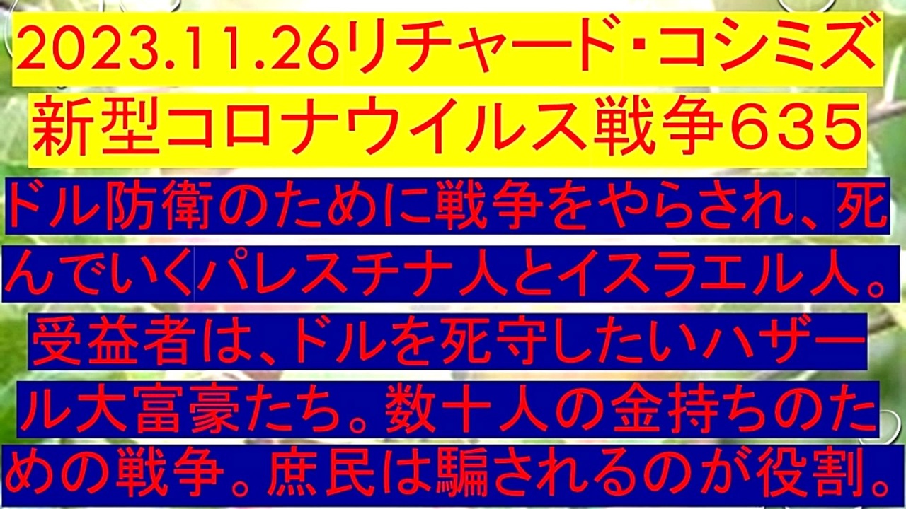 <span style="color: #cc4125;"><strong>「 テーマ : 新型コロナウイルス戦争 635 」</strong></span><br><br><span style="color: #ff0000;"><strong>「『 ドル防衛 』のために『 戦争 』をやらされ、死んでいく『 パレスチナ人 』と『 イスラエル人 』。<br> 受益者は、『 ドル を死守 』したい『 ハザール大富豪たち 』。『 数十人の金持ちのための戦争 』。<br> 『 庶民は騙されるのが役割 』」</strong></span><br><br><span style="color: #0000ff;"><strong>「『 イベルメクチン・アビガン・その他コロナ対策 』について、ご意見をお寄せ下さい! 」<br><br> ◐ E-mail:richardkoshimizu@gmail.com</strong></span><br><br><strong>◐「クリエイター・サポート」・「ニコニ広告」・「フォロー」等、ご協力の程宜しくお願い致します。RK</strong><br><br><span style="color: #38761d;"><strong>◐ リチャード・コシミズ『 ニコニコ チャンネル 』</strong></span><br> <span style="color: #38761d;"><strong><a href="https://ch.nicovideo.jp/richardkoshimizu" target="_blank" rel="noopener nofollow">https://ch.nicovideo.jp/richardkoshimizu</a><br><br>◐ リチャード・コシミズ 講演会『 ニコニコ生放送「 LIVE 」』</strong></span><br> <span style="color: #38761d;"><strong><a href="https://bit.ly/3Bx8F5w" target="_blank" rel="noopener nofollow">https://bit.ly/3Bx8F5w</a><br><br>◐ リチャード・コシミズ『 Rumble 』公式 動画ギャラリー</strong></span><br> <span style="color: #38761d;"><strong><a href="https://rumble.com/user/richardkoshimizu" target="_blank" rel="noopener nofollow">https://rumble.com/user/richardkoshimizu</a><br><br>◐『 リチャード・コシミズ 講演会 』公式 動画ギャラリー</strong></span><br> <span style="color: #38761d;"><strong><a href="http://www.t-sskk.com/richardkoshimizu/video-gallery/index.html" target="_blank" rel="noopener nofollow">http://www.t-sskk.com/richardkoshimizu/video-gallery/index.html</a></strong></span>