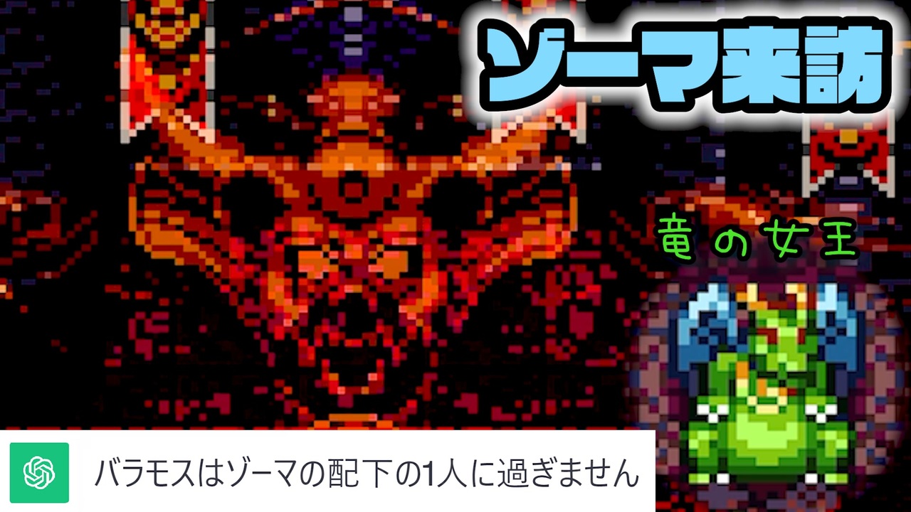 <br><strong>バラモス戦、果たしてどうなる!?<br>(サムネでネタバレ)</strong><br><br><span style="color: #ff0000;">~基本ルール~-</span><br>①GPTは勇者を殺す為の行動を取る<br>②GPTは魔法使いのキャラとして作成し、その操作は<br>この全ルールを把握したchatGPTに都度聞いて任せる。<br>③GPTはわざと自殺・MP回復拒否するような行動は取れない<br>④GPTはパーティの1番前か1番後ろに配置させる<br>⑤GPTの持ち物や呪文はGPTの意思でしか移動・使用できない<br>⑥買い物時は全てプレイヤーの自由にできる<br>⑦リセットや、データを消去して1からやり直しても良い<br>⑧経験値を伴わない裏での金稼ぎ作業時のみルール全て例外とする<br><br><span style="color: #0000ff;">~禁じ手~</span><br>①操作キャラでGPTに危害を加える行為(危害=ダメージや悪い状態異常など)<br>※メダパニで混乱したせいで殴る、などは許される<br>②戦闘中にGPTが死んだ際に放置(その次のターン中に蘇生させなければいけない)<br>③戦闘開始or終了時にGPTが死んでいる<br>④GPTのMPが0か1の時にHP回復の選択(蘇生も)を<br>GPT以外のメンバーに対して取る ※宿屋系はOK<br>⑤GPT以外の仲間がマホカンタ状態になる<br>⑥GPTがいない状態で戦闘を開始or続けるor勝利(バシルーラ等でいなくなったら逃げる行動のみ可)<br>⑦商人の特技「あなほり」を使うこと <br>⑧しあわせのくつの使用<br><br><span style="color: #38761d;">勇者が死ぬ or 上記を破る度にGPTに強制リセット。「リセット」をする度にGPTに1pt。<br>50pt貯まったらGPTの勝ち。企画終了。</span><br><br><strong>【次】 下のシリーズから飛んでね<br>【part1】 <a href="https://www.nicovideo.jp/watch/sm42595666" class="watch">sm42595666</a> 【投稿動画まとめ】 <a href="https://www.nicovideo.jp/mylist/32090282" target="_blank" rel="noopener">mylist/32090282</a></strong><br><br><span style="color: red;"><strong>▼投稿者情報▼</strong></span><br>【 Twitter 】 <a href="https://twitter.com/wakou2525" target="_blank" rel="noopener nofollow">https://twitter.com/wakou2525</a><br>【生放送コミュ】 co1668349<br>【意見・連絡先】 wakou2525otayori@yahoo.co.jp