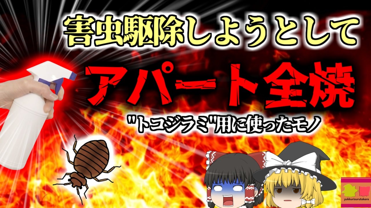 <a href="#" class="seekTime" data-seekTime="00:00" onclick="seekNicoPlayer('#00:00'); return false;">#00:00</a> 冒頭挨拶<br><a href="#" class="seekTime" data-seekTime="00:19" onclick="seekNicoPlayer('#00:19'); return false;">#00:19</a> 火災<br><a href="#" class="seekTime" data-seekTime="1:36" onclick="seekNicoPlayer('#1:36'); return false;">#1:36</a> 視聴上の注意<br><a href="#" class="seekTime" data-seekTime="2:04" onclick="seekNicoPlayer('#2:04'); return false;">#2:04</a> 本編開始<br><a href="#" class="seekTime" data-seekTime="4:08" onclick="seekNicoPlayer('#4:08'); return false;">#4:08</a> 原因<br><a href="#" class="seekTime" data-seekTime="4:39" onclick="seekNicoPlayer('#4:39'); return false;">#4:39</a> 消毒用アルコール<br><a href="#" class="seekTime" data-seekTime="5:09" onclick="seekNicoPlayer('#5:09'); return false;">#5:09</a> "トコジラミ"<br><a href="#" class="seekTime" data-seekTime="6:52" onclick="seekNicoPlayer('#6:52'); return false;">#6:52</a> 取り扱いに注意<br><br>今回紹介するのは、アメリカで発生していた、とある珍しい火災事例の一つです。<br>アメリカ合衆国西部、ミシガン州のとある街ではこの日の深夜、一件のアパート火災が発生していました。<br>このアパートは、50世帯が暮らす大きな集合住宅で、この日の午前2時ごろ、地元消防の元に「三回から火が出ている」といった内容の通報が入り、消防隊は現場に急行。<br>この時点で、アパートはすでに三回より上の部分に火が回っており、住人たちは表の道路に避難していたところでした。消防は直ちに消火活動に入り、レスキュー隊によって、負傷者の搬送が行われました。<br>火災は明け方までに鎮火したものの、アパートは全焼。複数の負傷者を出す、大きな災害となりました。<br>警察・自治体はその後、出火原因などの調査を行い、どうやら三階の一室にある、寝室のストーブ付近から出火していたとみられ、この部屋に暮らしていた独身女性「Aさん」から事情を聴くことに。<br>すると、衝撃の事実が判明。なんとAさんはあの日の深夜、寝室で発生していた"トコジラミ"を駆除しようと、消毒用アルコールを寝具やソファーなどに大量に散布しており、それが近くで使用していたオイルストーブの火で引火。<br>慌てて毛布で消火しようとしたAさんでしたが、その毛布にも大量のアルコールがしみ込んでおり・・・<br><br><br />※この動画は過去の事件を知り、現在でも同じことが発生する危険性を再認識、関与しないように促すための動画であり、視聴者を扇動、動揺を誘うためのコンテンツではありません。<br><br>ご要望にお応えして、メンバーシップの開設を行いました。<br>下記URLからも登録可能ですので、ご興味がある方は是非ご参加ください。<br><a href="https://www.youtube.com/channel/UCcT5a1J7XJW7CLYI2RKl4pw/join" target="_blank" rel="noopener nofollow">https://www.youtube.com/channel/UCcT5a1J7XJW7CLYI2RKl4pw/join</a><br><br><br>Twitter<br>→<a href="https://twitter.com/yukkurisurutoko" target="_blank" rel="noopener nofollow">https://twitter.com/yukkurisurutoko</a><br><br>取り急ぎ、簡易的にですがマイリストを作りました。<br>【ゆっくり解説】事故・事件関係紹介リスト <br><a href="https://www.nicovideo.jp/mylist/71034319" target="_blank" rel="noopener nofollow">https://www.nicovideo.jp/mylist/71034319</a><br>【ゆっくり解説】放射線系事故<br><a href="https://www.nicovideo.jp/mylist/71034368" target="_blank" rel="noopener nofollow">https://www.nicovideo.jp/mylist/71034368</a><br>【ゆっくり解説】鉄道系事故・事件関連<br><a href="https://www.nicovideo.jp/mylist/71034379" target="_blank" rel="noopener nofollow">https://www.nicovideo.jp/mylist/71034379</a>