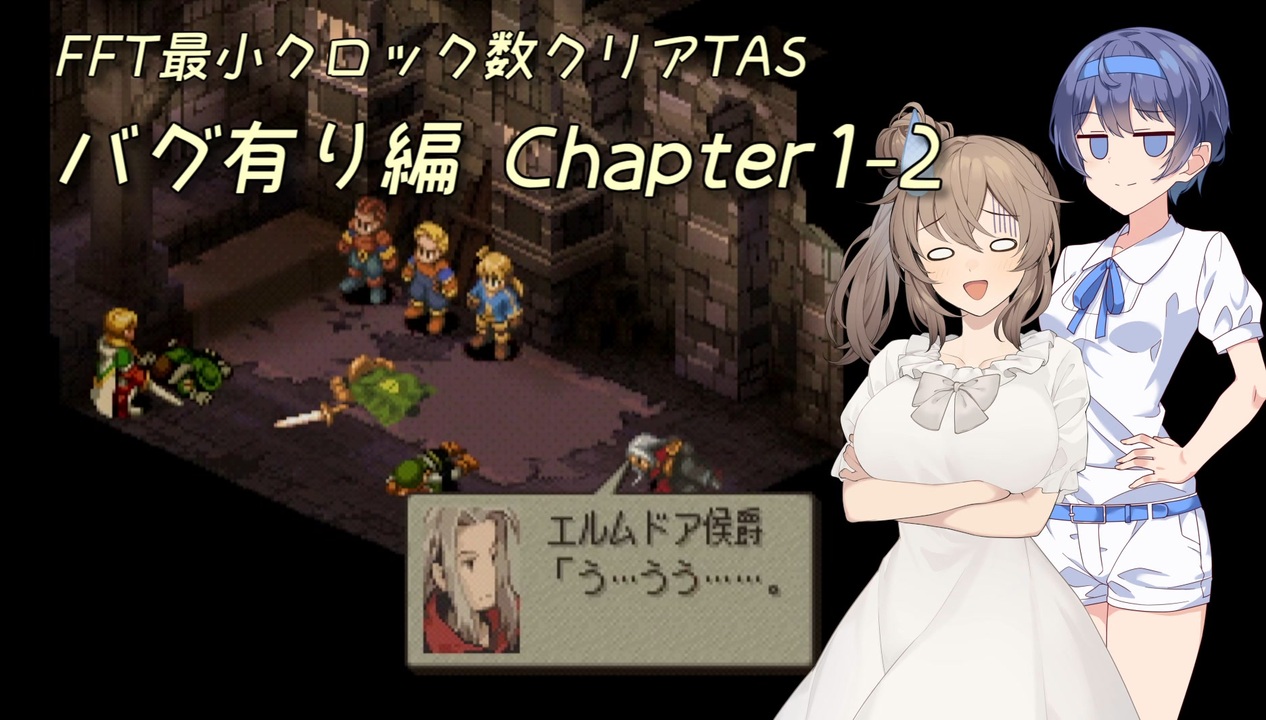 バグ有りシリーズのはずなのにバグ無しの更新点もどんどん出てくるんですが。<br><br>--<br>PS版FFTのシナリオを最小クロック・バグ有りでクリアするTAS動画です。<br>合成音声による解説がありますので、苦手な方はご注意ください。<br><br>【プレイ条件】<br>1. 戦闘はシナリオ順に最小クロックでクリア<br>2. データセーブおよびロード禁止<br>※ バグはがんがん利用していきます<br><br>【プレイ環境】<br>エミュレータ: BizHawk 2.3.1<br>最終キー入力: 3,720,478F(17:25:47.484)<br>追記回数: 36,197<br><br>【プレイ資料やキームービーファイル等】<br><a href="https://ux.getuploader.com/fftminclock/" target="_blank" rel="noopener nofollow">https://ux.getuploader.com/fftminclock/</a><br>pass: fft-min-clock<br><br>【お借りした素材】<br>◆ ささらちゃん立ち絵素材 v1.0 / しりんだーふれいる 様 (<a href="https://seiga.nicovideo.jp/seiga/im10852558" target="_blank" rel="noopener">im10852558</a>)<br>◆ すずきつづみ立ち絵素材ver1.0.0 / こーすけさんたまりあ 様 (<a href="https://seiga.nicovideo.jp/seiga/im11112070" target="_blank" rel="noopener">im11112070</a>)<br>◆ いいね押し忘れ防止ちゃん / nakatomi 様 (<a href="https://seiga.nicovideo.jp/seiga/im10742089" target="_blank" rel="noopener">im10742089</a>)<br>◆ ニコニ・コモンズ<br><br>マイリスト:<a href="https://www.nicovideo.jp/mylist/75980441" target="_blank" rel="noopener">mylist/75980441</a><br>進捗報告:<a href="https://twitter.com/spherewind1" target="_blank" rel="noopener nofollow">https://twitter.com/spherewind1</a><br><br><a target="_blank" href="https://qa.nicovideo.jp/faq/show/19424?site_domain=default" style="font-size: 13px;color: #657586; text-decoration: underline; line-height: 1.4">この動画は投稿者によって修正されました</a>